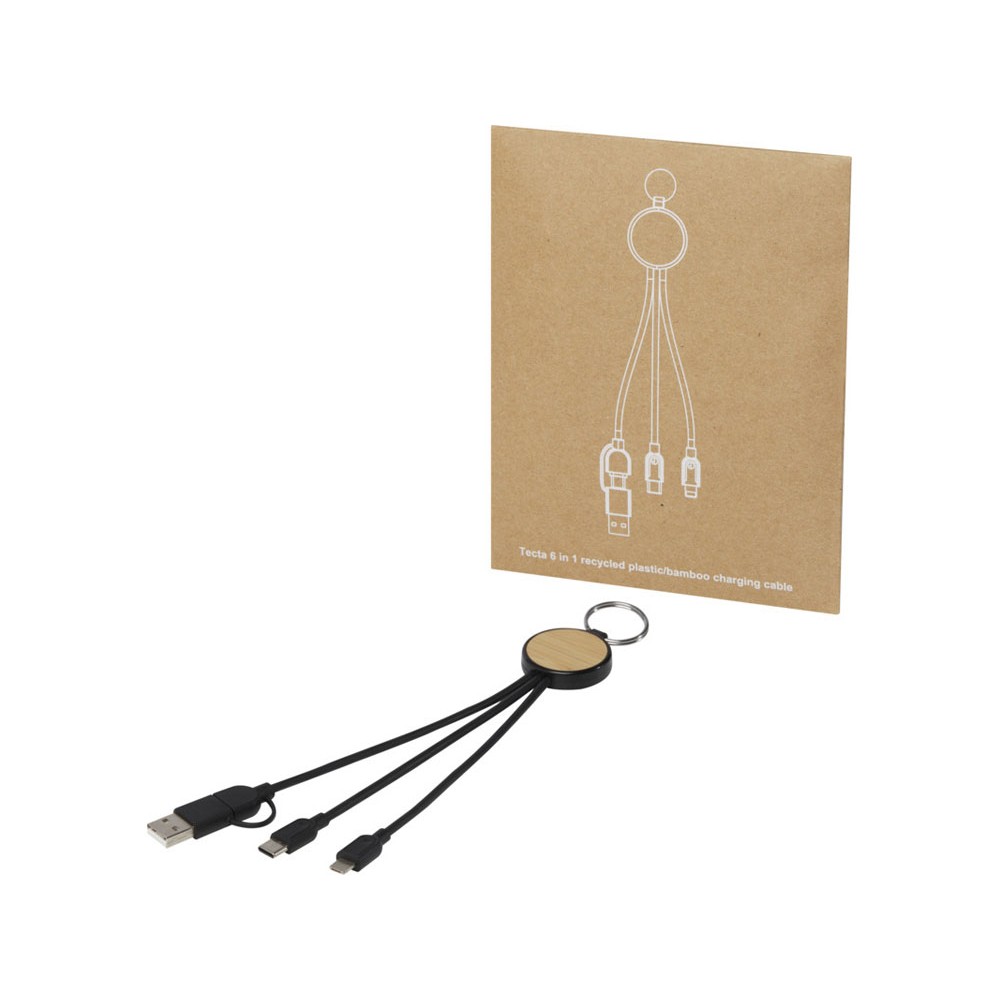 • Кабель для зарядки Tecta «6 в 1» из переработанного пластика/бамбука с брелком, сплошной черный