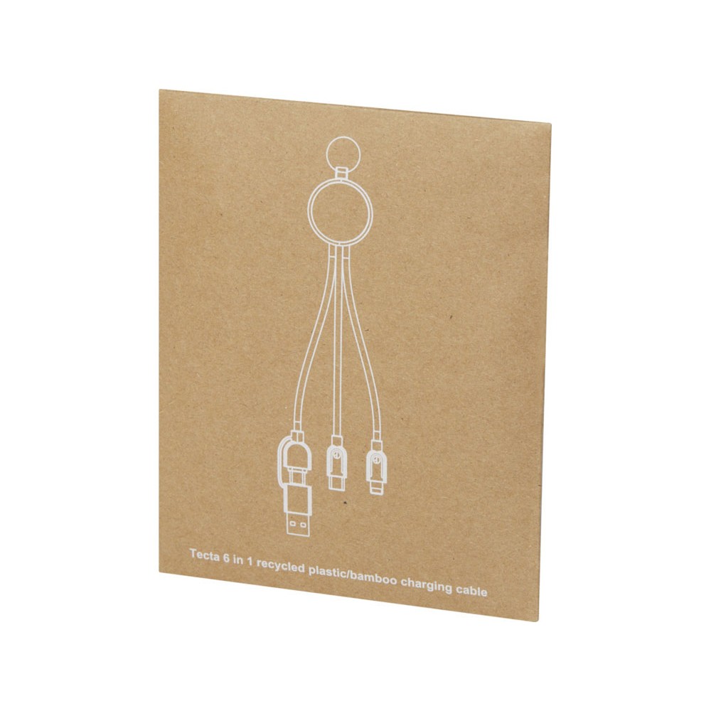 Зарядный кабель Tecta «6 в 1» из бамбука и переработанного пластика демонстрирует, где экологичность сочетается со стилем. Кабель длиной 25 см из переработанного TPE-пластика обеспечивает мощность зарядки 2 А. Входная мощность: USB A и Type-C. Выход: Type-C, micro USB и двойные наконечники 2 в 1 micro USB и Lightning, совместимые как с устройствами iOS, так и с устройствами Android. Алюминиевые наконечники USB обеспечивают надежное и стабильное соединение, гарантируя надежную зарядку каждый раз. Серебряный брелок из нержавеющей стали служит удобным способом для организации и переноски кабеля. Упакован в конверт из крафт-бумаги.