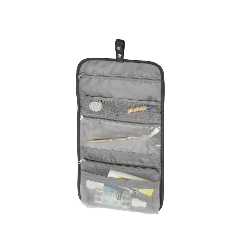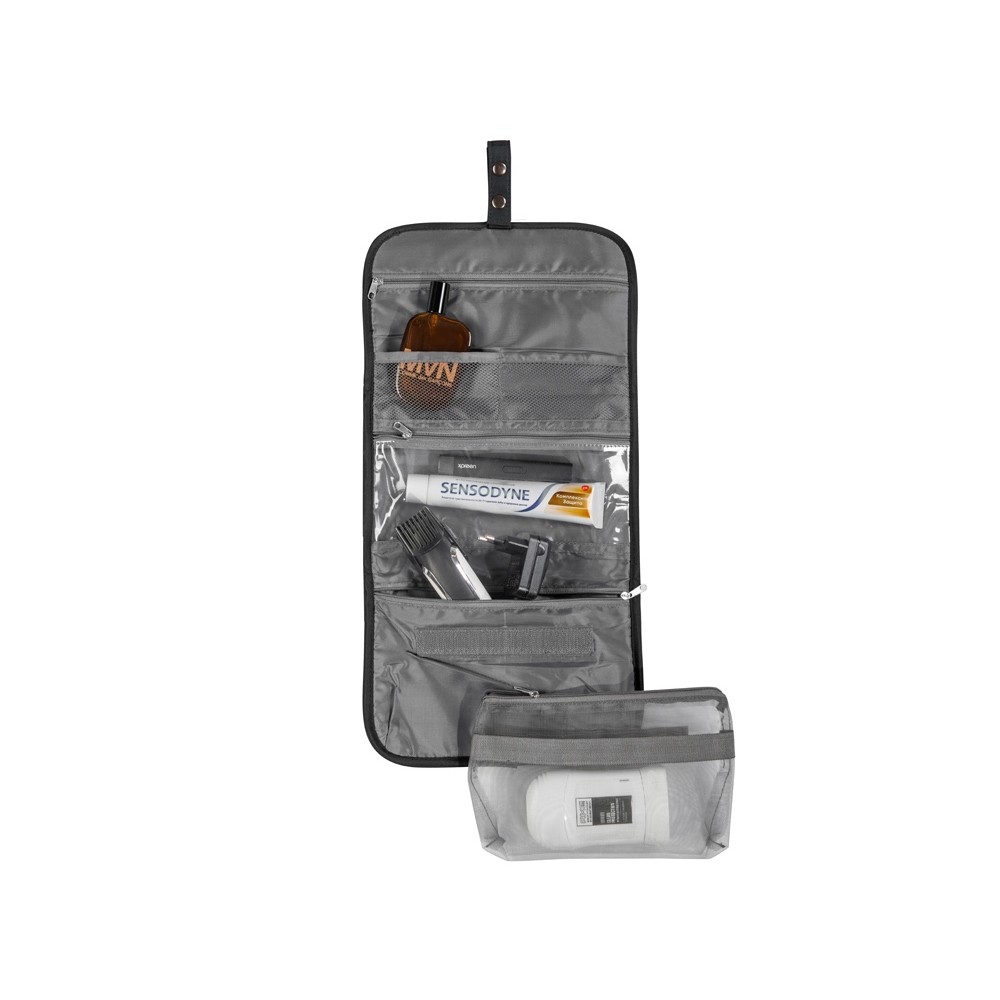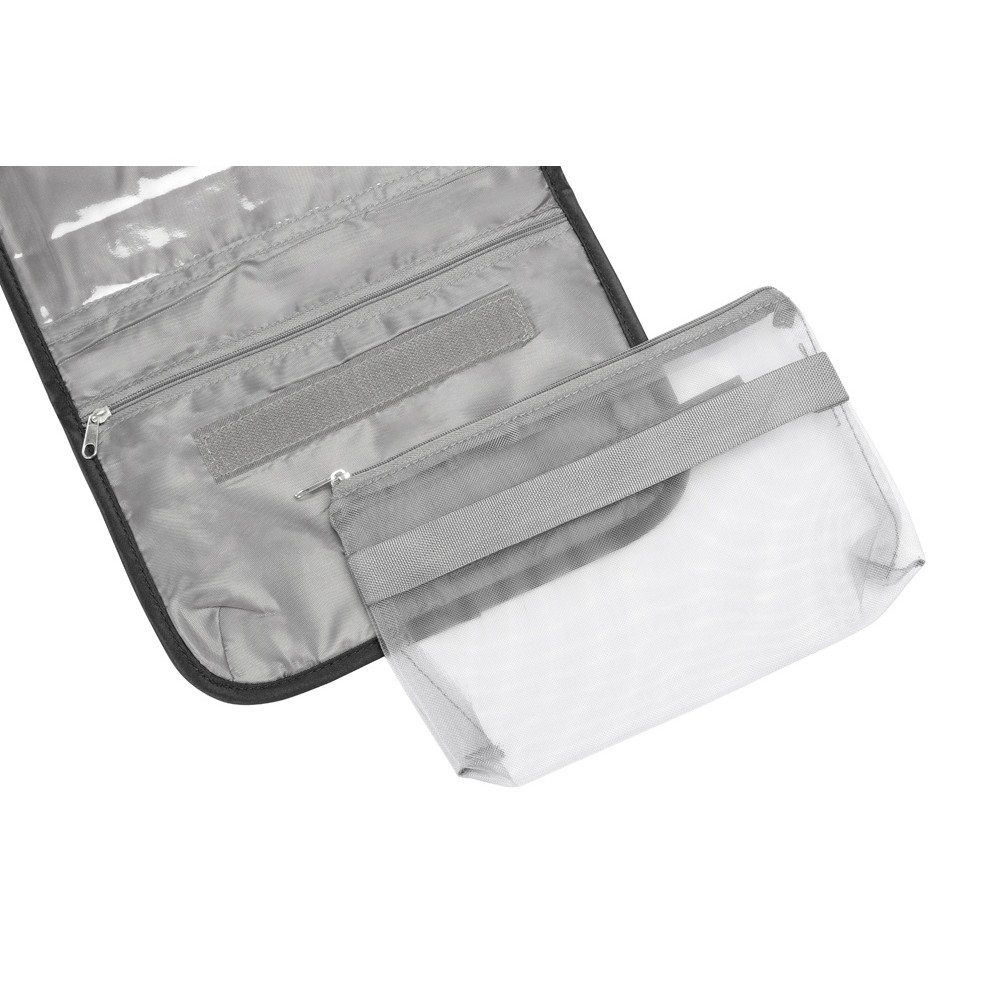 Органайзер состоит из карманов на молнии, карманов-сеток, прозрачного моющегося кармана на молнии, в который можно поместить флаконы с жидкостью — даже если емкость разгерметизируется, карман легко очистить под струей воды.