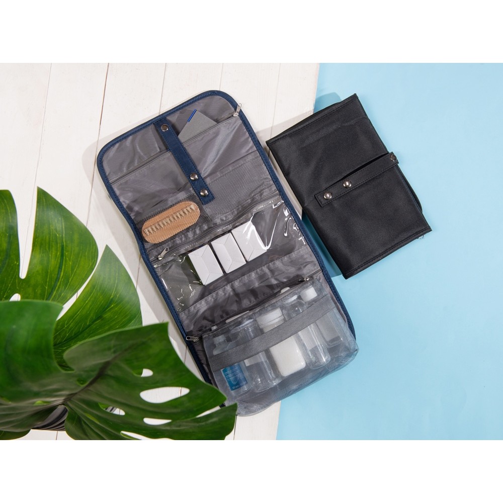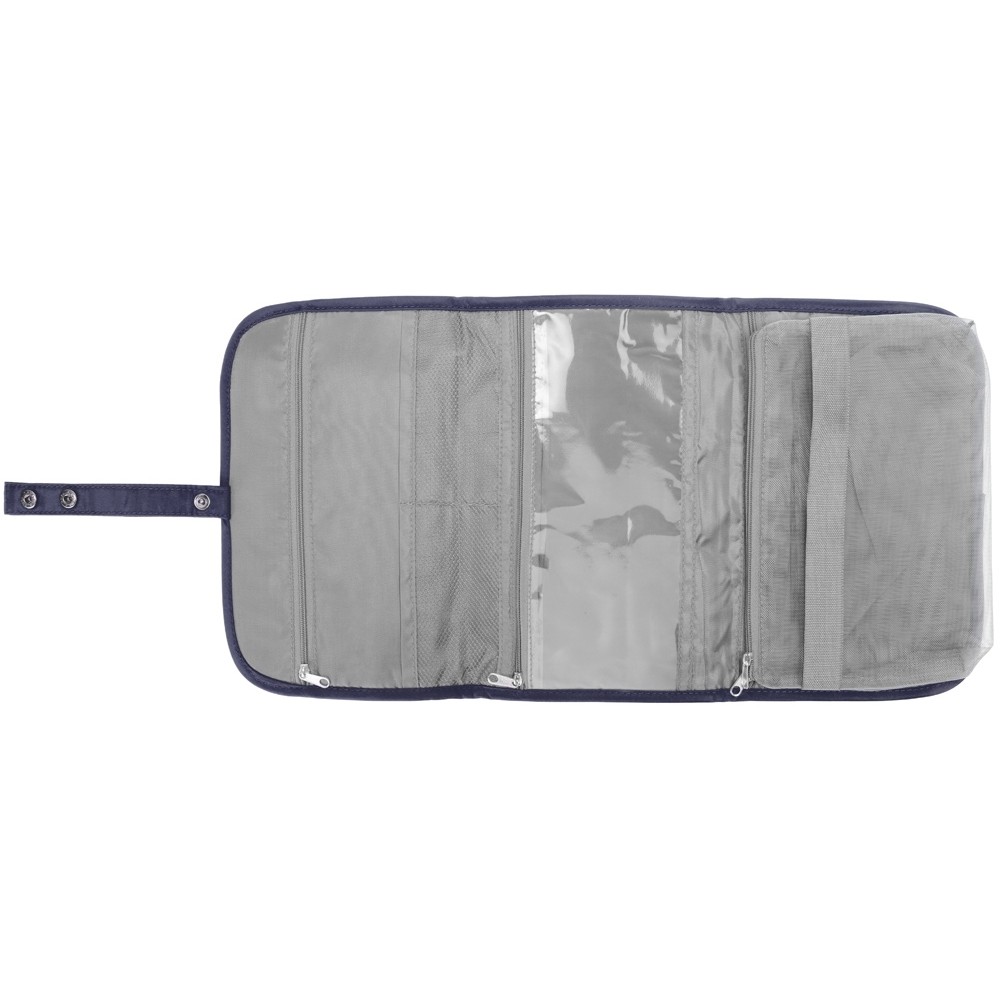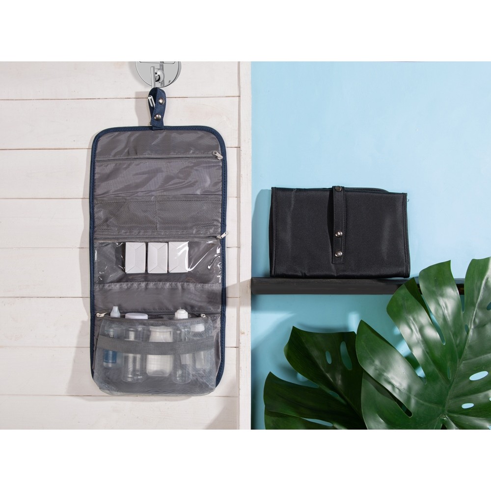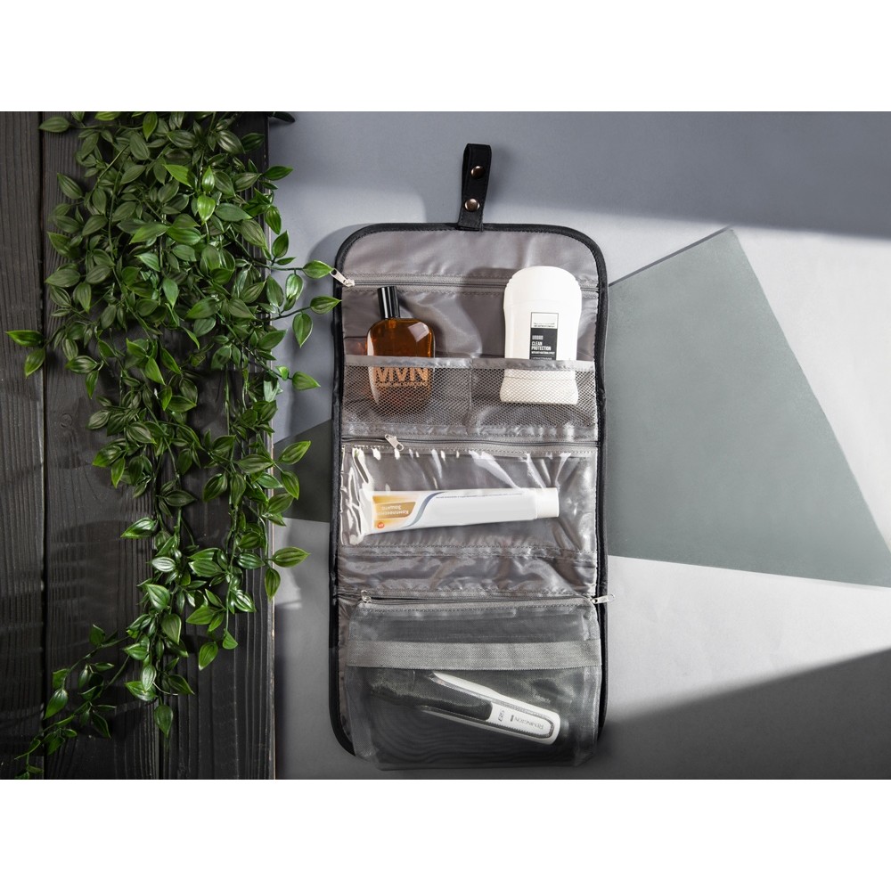 Органайзер состоит из карманов на молнии, карманов-сеток, прозрачного моющегося кармана на молнии, в который можно поместить флаконы с жидкостью — даже если емкость разгерметизируется, карман легко очистить под струей воды.
