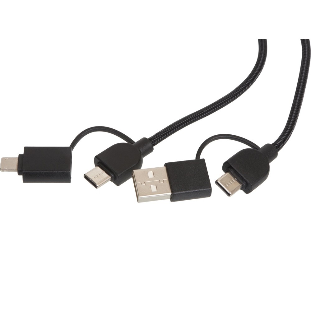 Кабель оснащён всеми популярными типами разъёмов — USB-C, USB-A, Lightning — что позволяет использовать его с широким спектром устройств: смартфонами, планшетами, наушниками, портативными колонками и другими гаджетами.