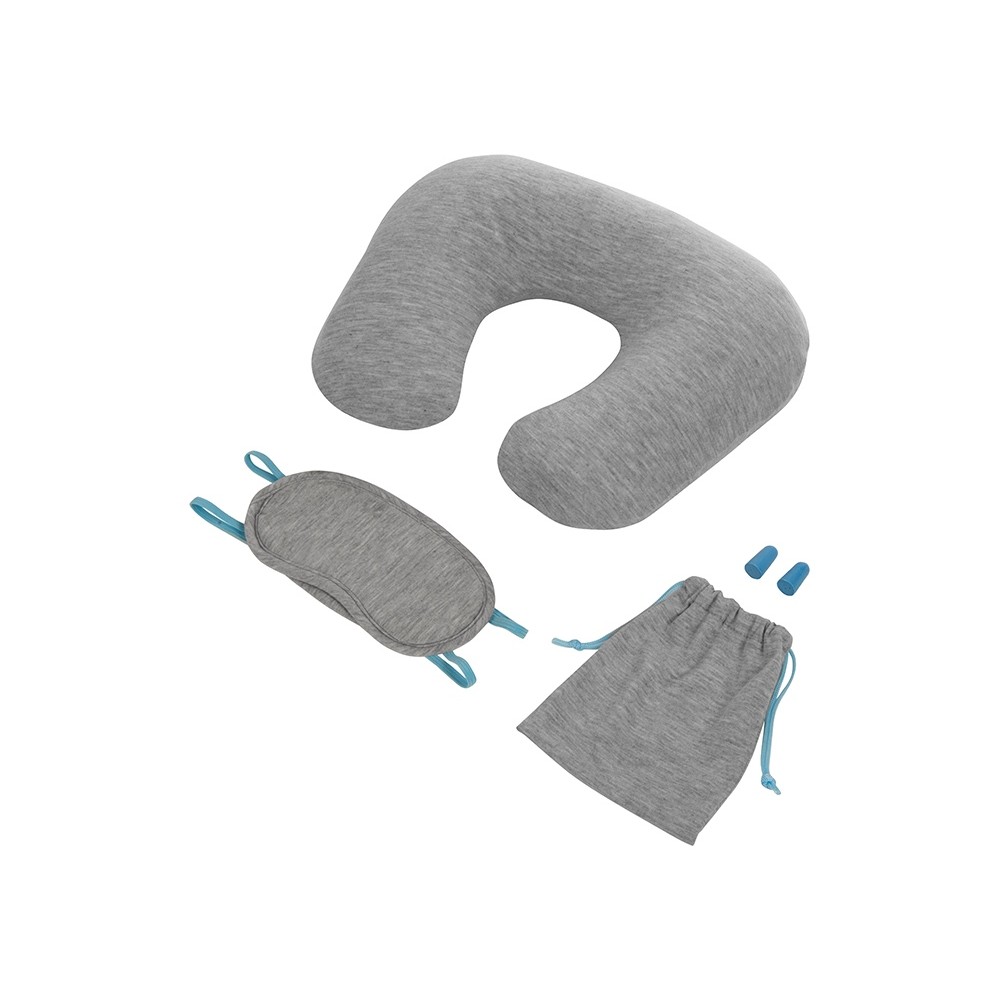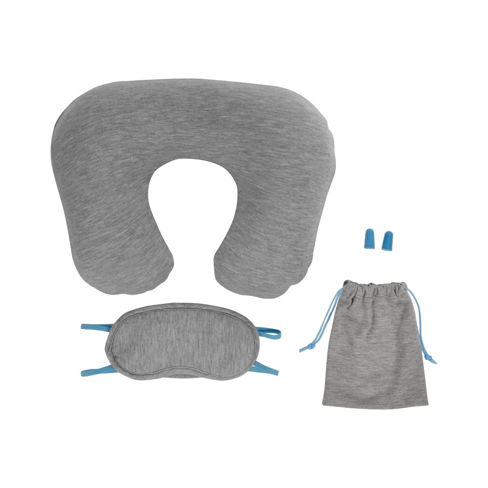 Набор выполнен из мягких комфортных материалов и включает в себя надувную подушку, маску для глаз, беруши и мешочек на завязках.