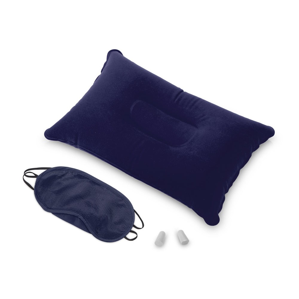Путешествуйте с комфортом вместе с дорожным набором "Cloud", который включает в себя подушку из ПВХ прямоугольной формы, повязку на глаза и полиуретановые беруши.