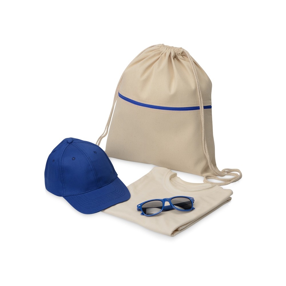 Цвет товара рюкзак- натуральный/синий, футболка- натуральный, бейсболка- синий, очки- синий