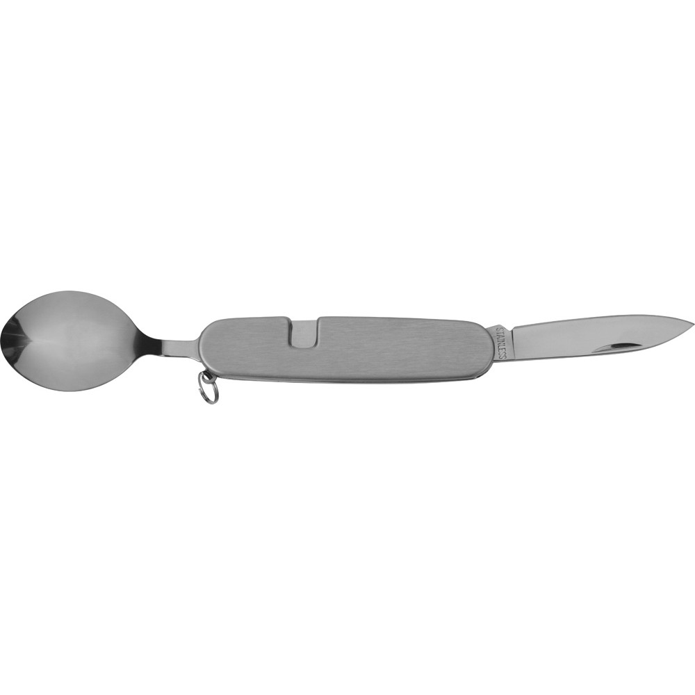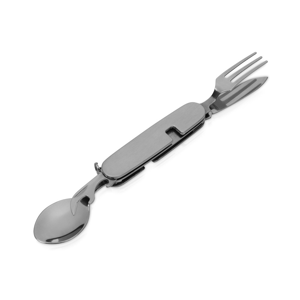 В нем есть все, что необходимо - ложка, вилка, ножик, открывалка бутылок и жестяных банок. Также имеется удобное кольцо для подвешивания. Набор разделяется на две части.