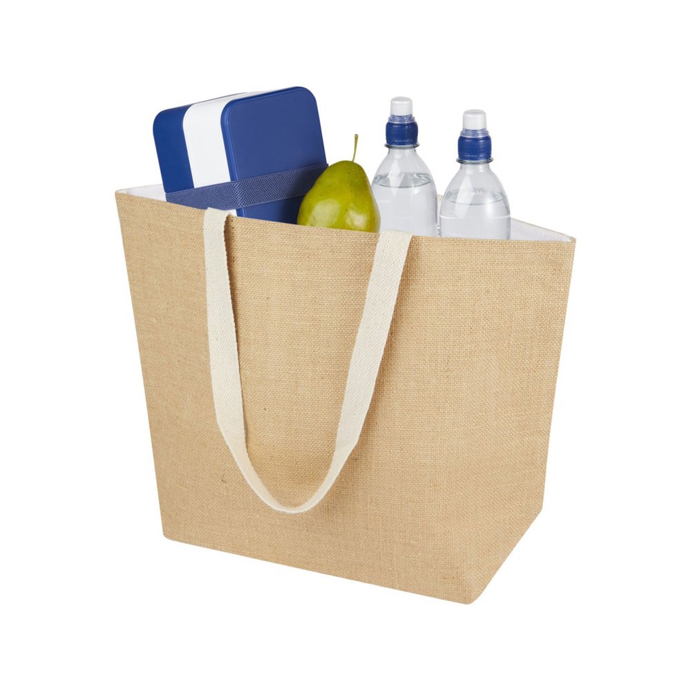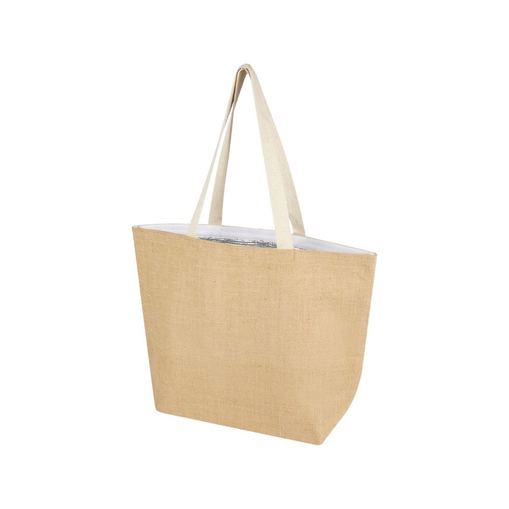 Стильная сумка-холодильник Джута изготовлена из прочного и износостойкого ламинированного джута. Имеет большое главное отделение (12 литров), отделанное пищевой алюминиевой изоляцией, и верхнюю часть с застежкой на липучке, что позволяет хранить освежающие и замороженные продукты в холоде и защищать их от внешнего влияния на протяжении более длительного времени. Сумка имеет длинные ручки (30 x 2,5 см) из тканого хлопка и широкое дно. Сделано в Индии и сертифицировано OEKO-TEX®.