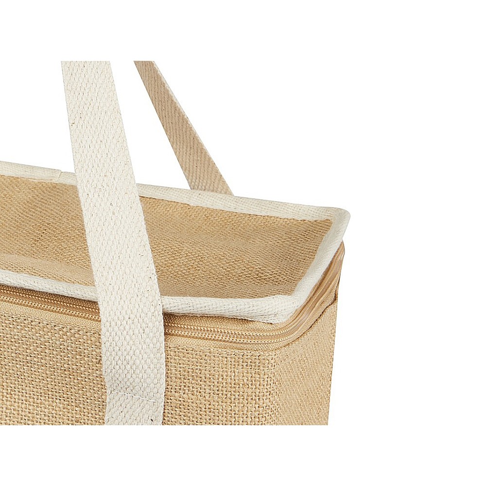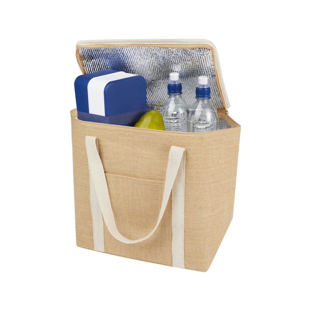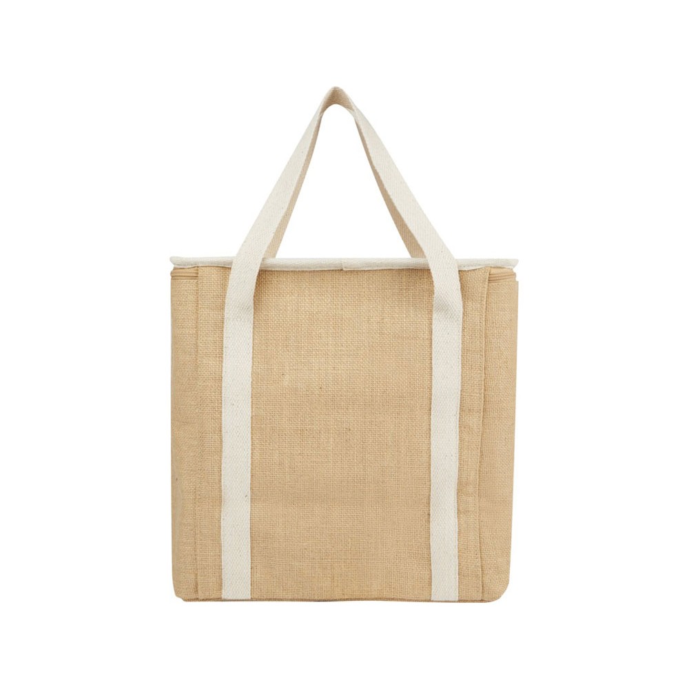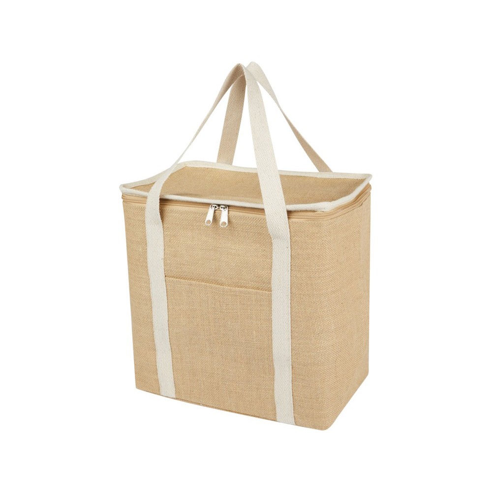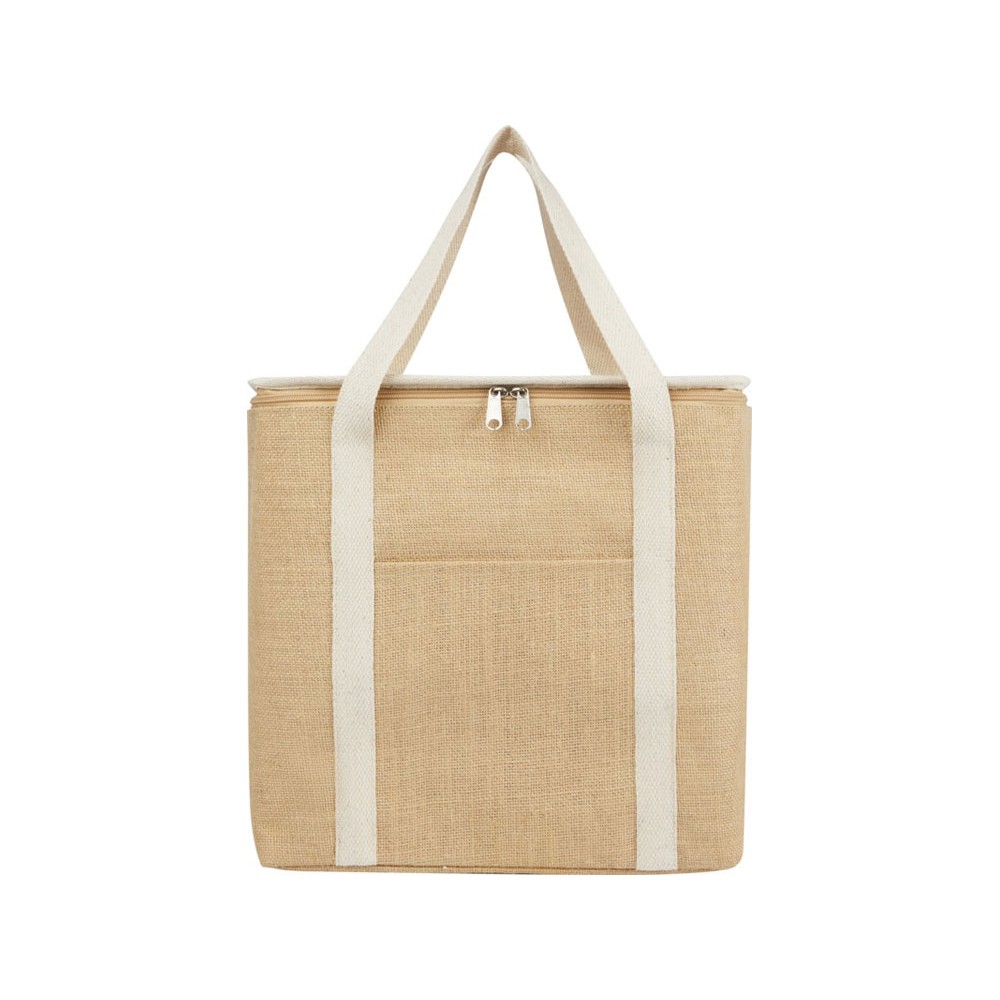 Большая сумка-холодильник Джута изготовлена из прочного и износостойкого ламинированного джута. Имеет большое главное отделение (19 литров), вмещающее шесть бутылок объемом 1,5 л, отделанное пищевой алюминиевой изоляцией, что позволяет хранить продукты, напитки и закуски в холоде, сухости и безопасности на протяжении нескольких часов. Сумка имеет верхнюю застежку на молнии, передний карман и 2 тканых хлопковых ручки для переноски (50 x 2,5 см). Сделано в Индии и сертифицировано OEKO-TEX®.