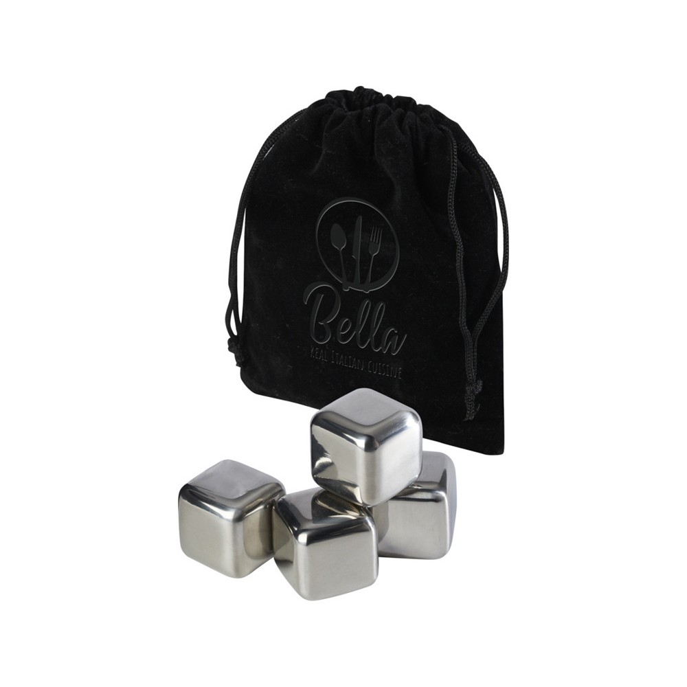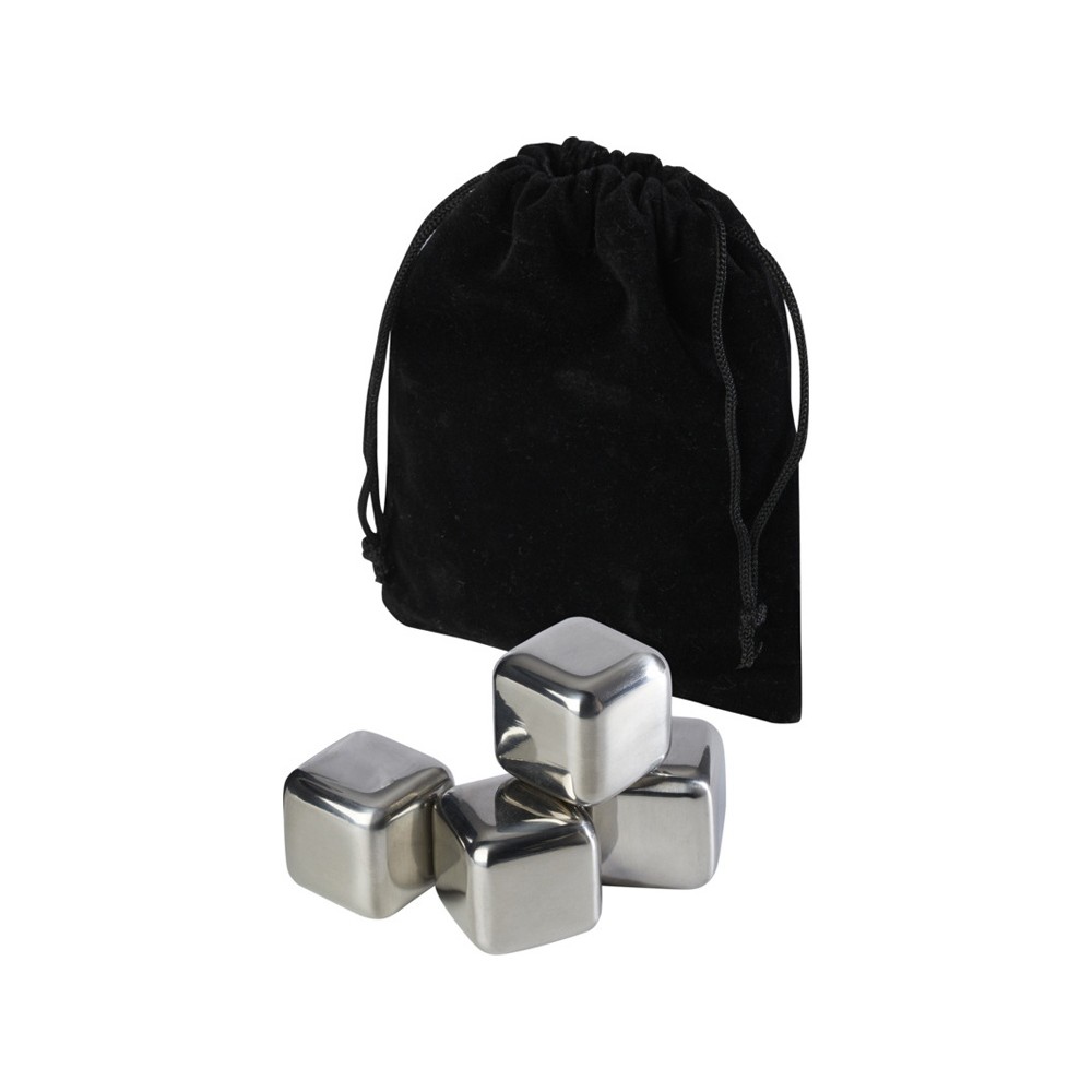 Набор из 4 многоразовых кубиков для охлаждения напитков из нержавеющей стали, поставляемых в бархатном мешочке. Эти кубики быстро и эффективно охлаждают напитки, сохраняя при этом их вкус. нержавеющая сталь, Бархат.