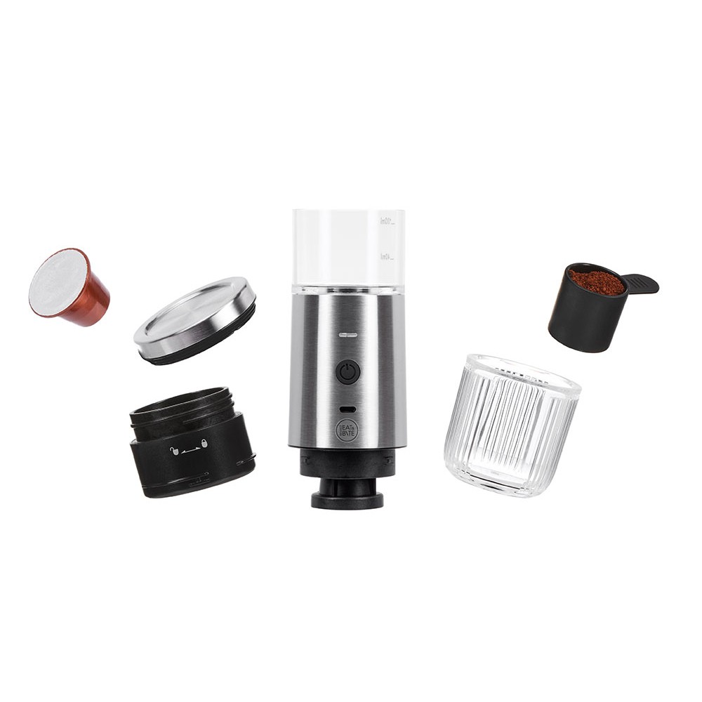 Приготовить можно 2 вида кофе — эспрессо и лунго (40 и 100 мл) двумя способами: заварить молотый кофе или капсулу типа Nespresso. Для каждого способа заваривания есть своя ёмкость. Мерная ложечка для молотого кофе идёт в комплекте.