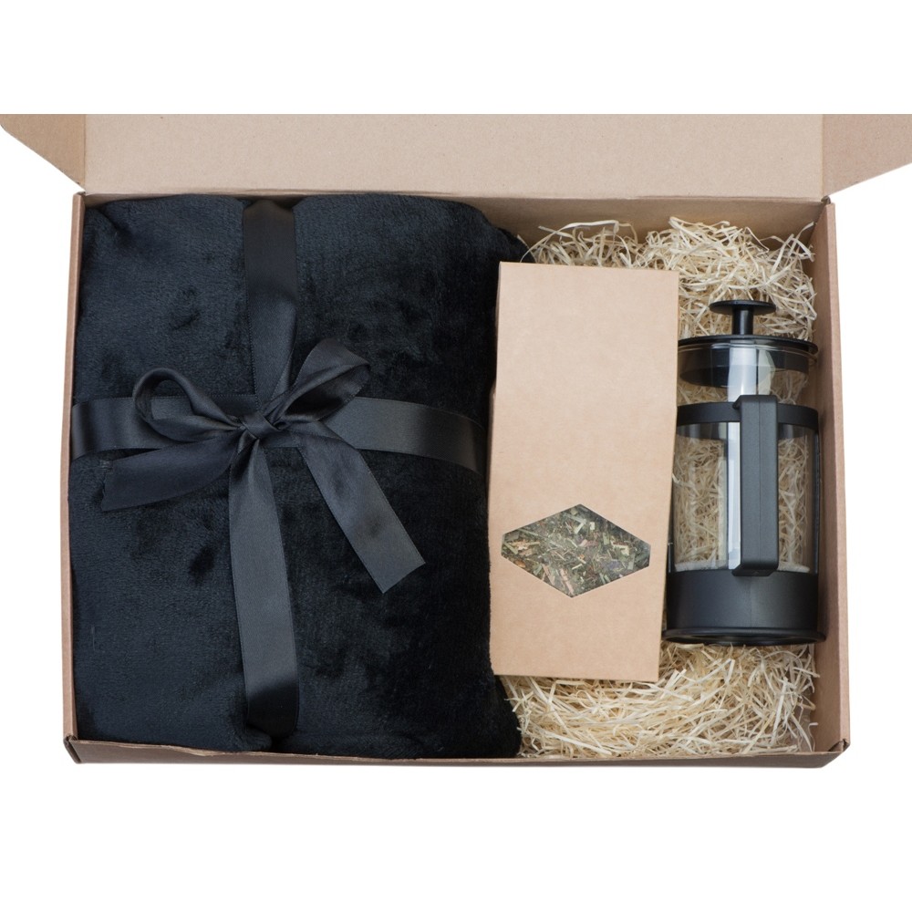 Набор продуман до мелочей. Когда зимним вечером подходит время чая, хочет завернуться в мягкий и теплый плед и наслаждаться любимым напитком, который можно заварить во френч прессе, входящем в комплект. Набор упакован в стильную крафтовую коробку.