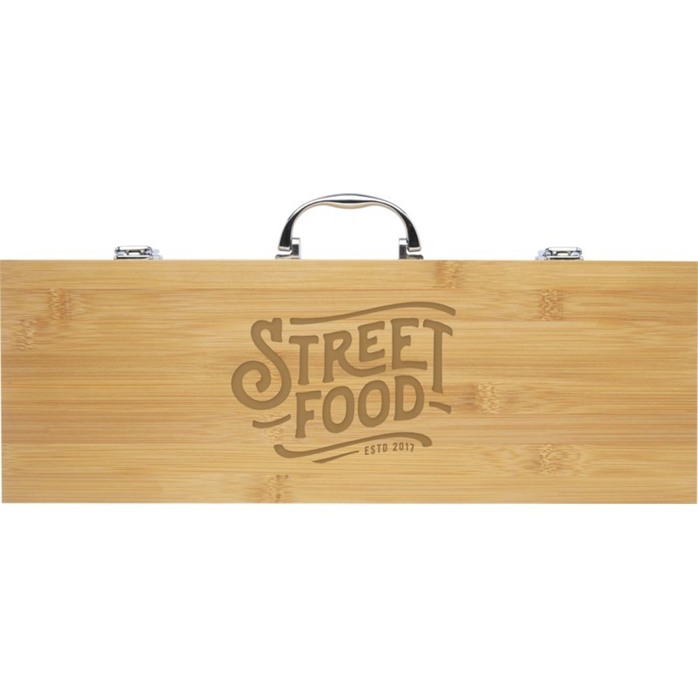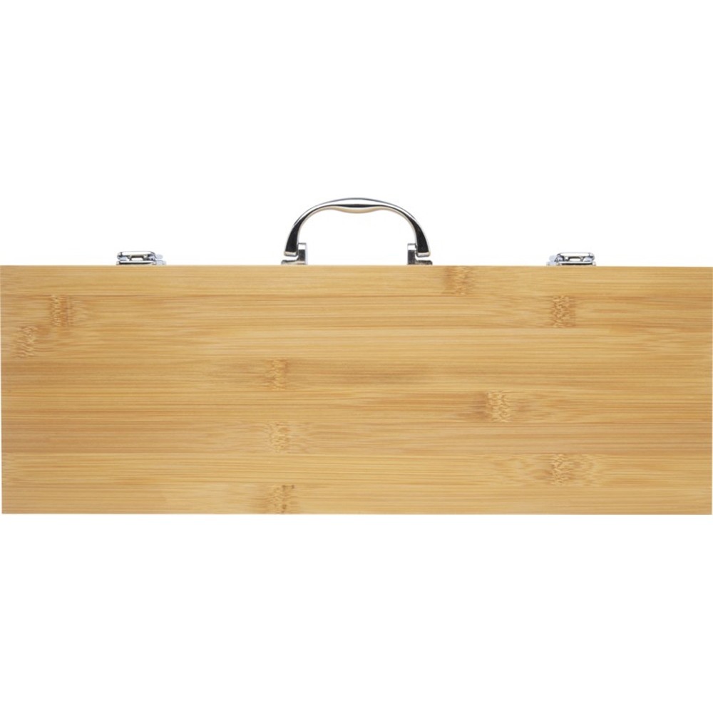 Набор для барбекю из 5 предметов из бамбука: лопатка (40 x 9,5 см), щипцы (34,5 x 6 см), вилка (38,5 x 3 см), нож (38,5 x 3 см) и щетка (38 x 4,3 см). Набор поставляется в подарочной коробке из бамбука (46 x 16,2 x 7,4 см). Ручки и подарочная коробка изготовлены из бамбука, который производится в соответствии со стандартами устойчивого развития.