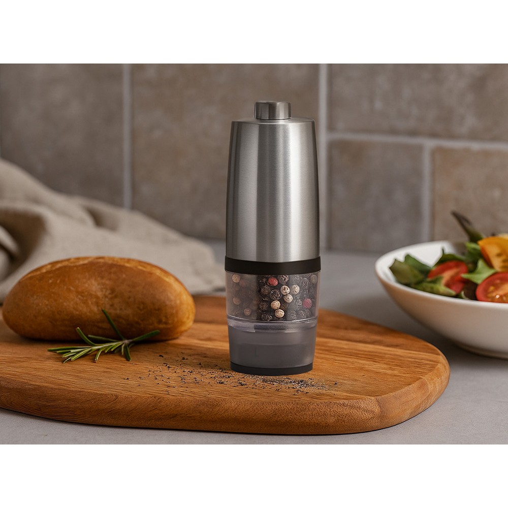 Современная и удобная электрическая мельница для соли, перца и других специй. Работает от 4 батареек AAA (не входят в комплект) — одним нажатием измельчает специи до нужной степени помола.