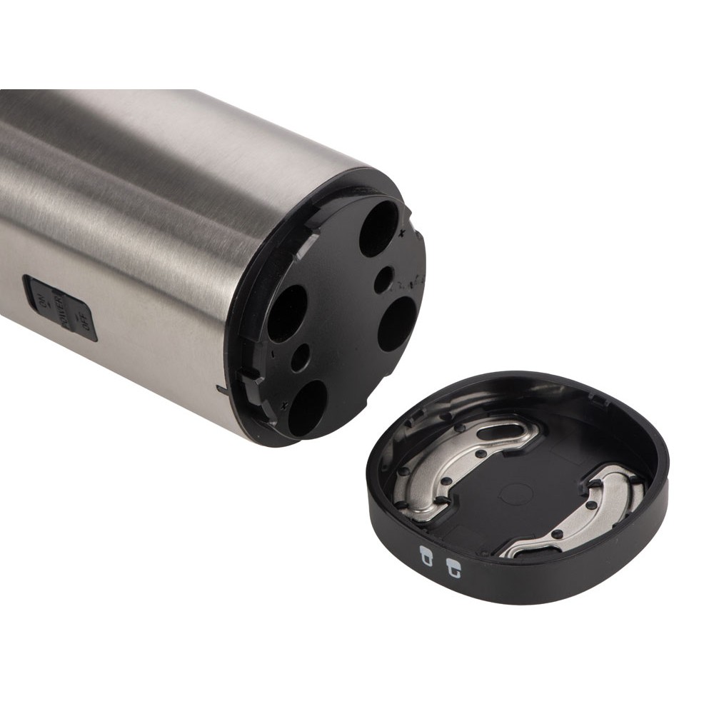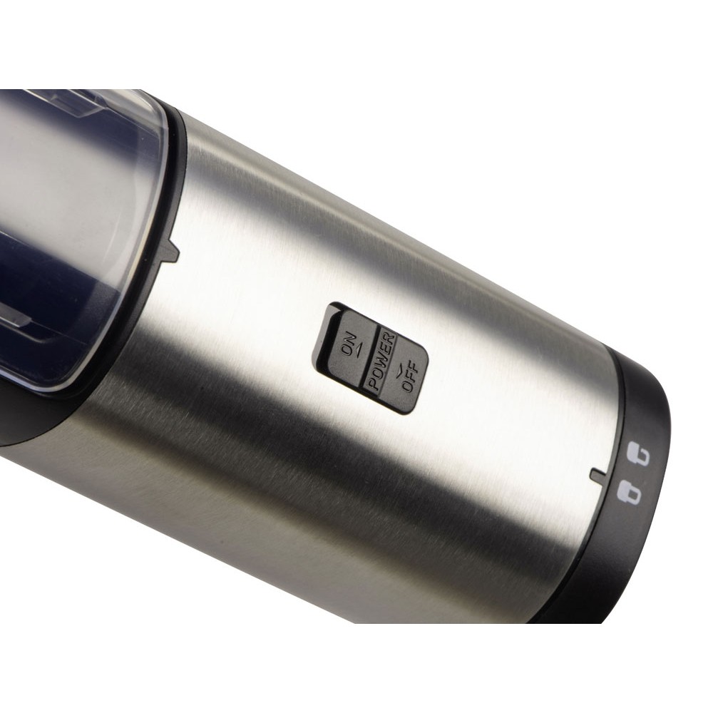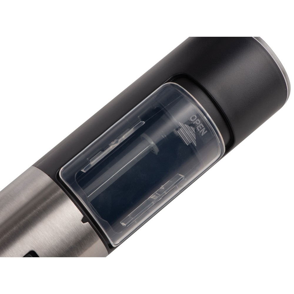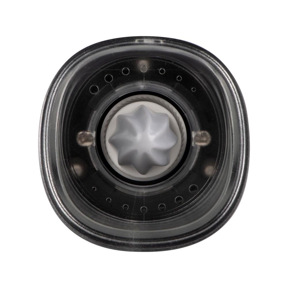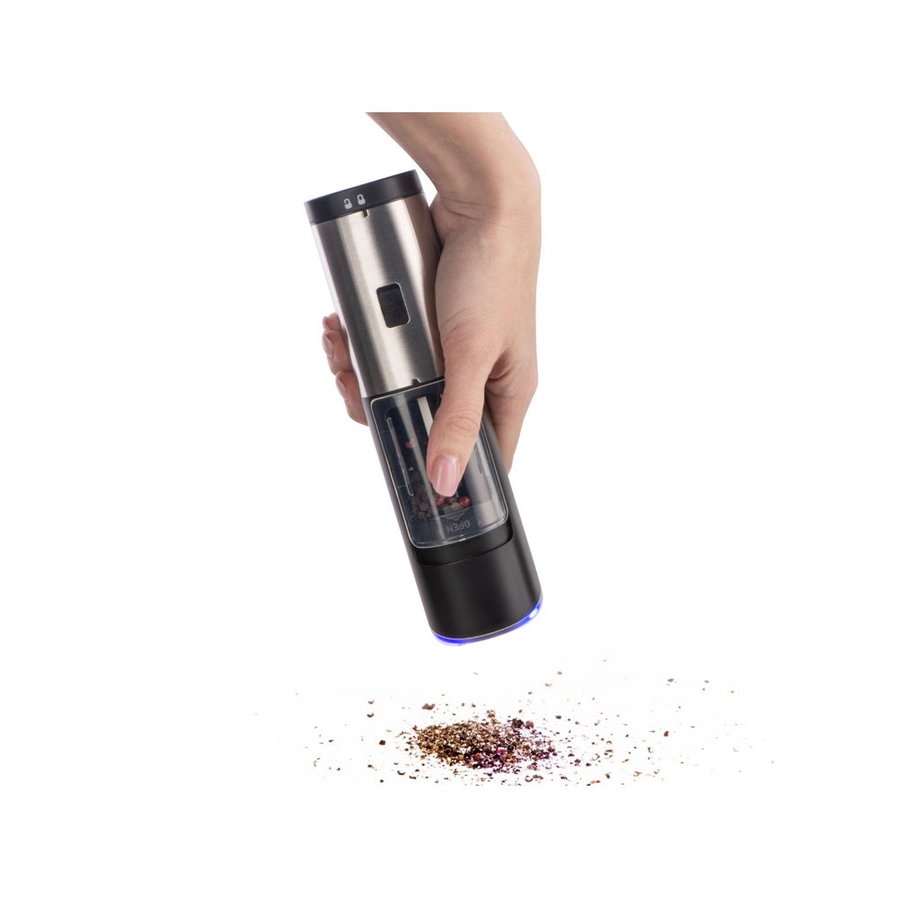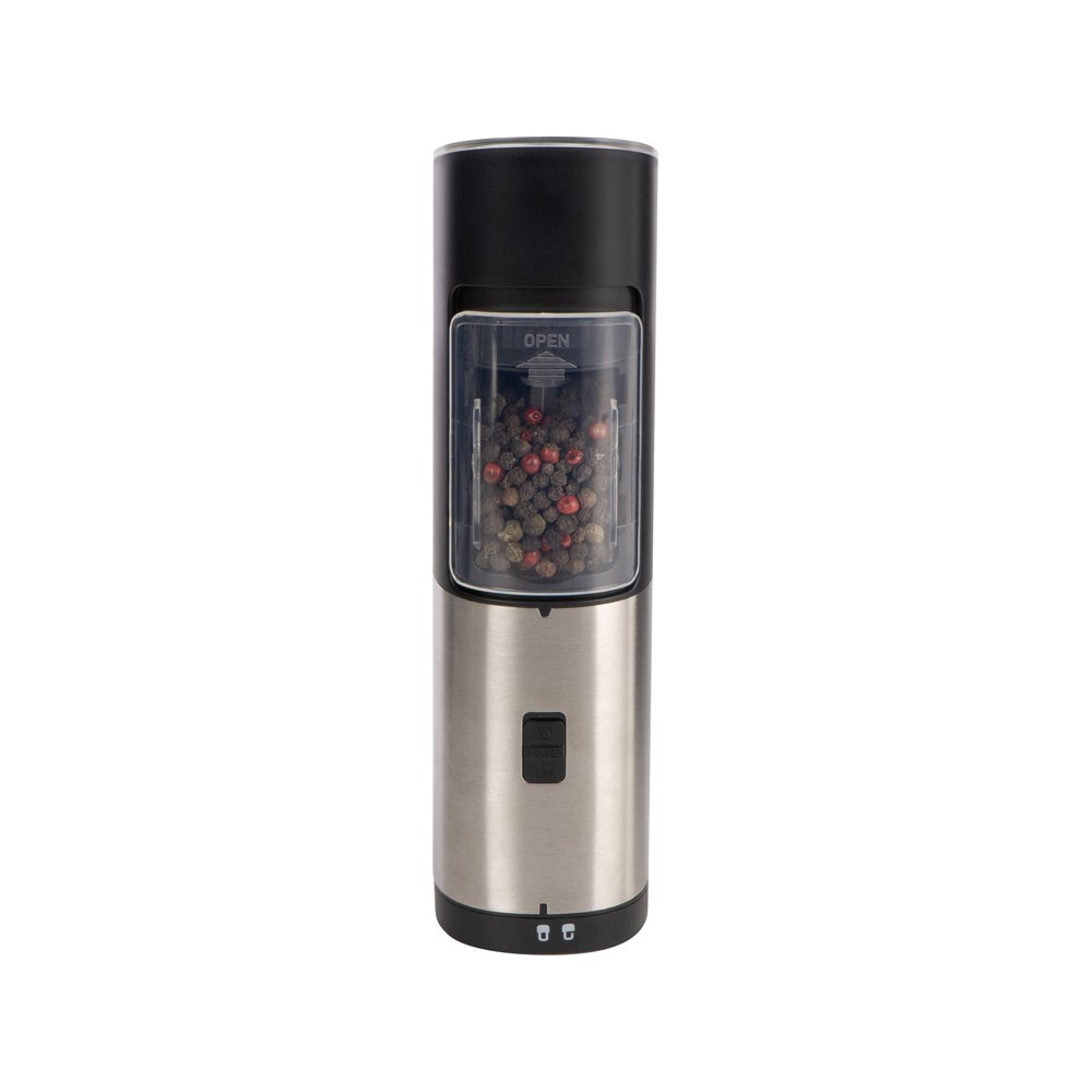 Мельница включается лишь в перевернутом положении, что позволяет снизить расход батареек и решает проблему случайного срабатывания устройства. Эргономичный корпус выполнен из нержавеющей стали и текстурного АБС-пластика.