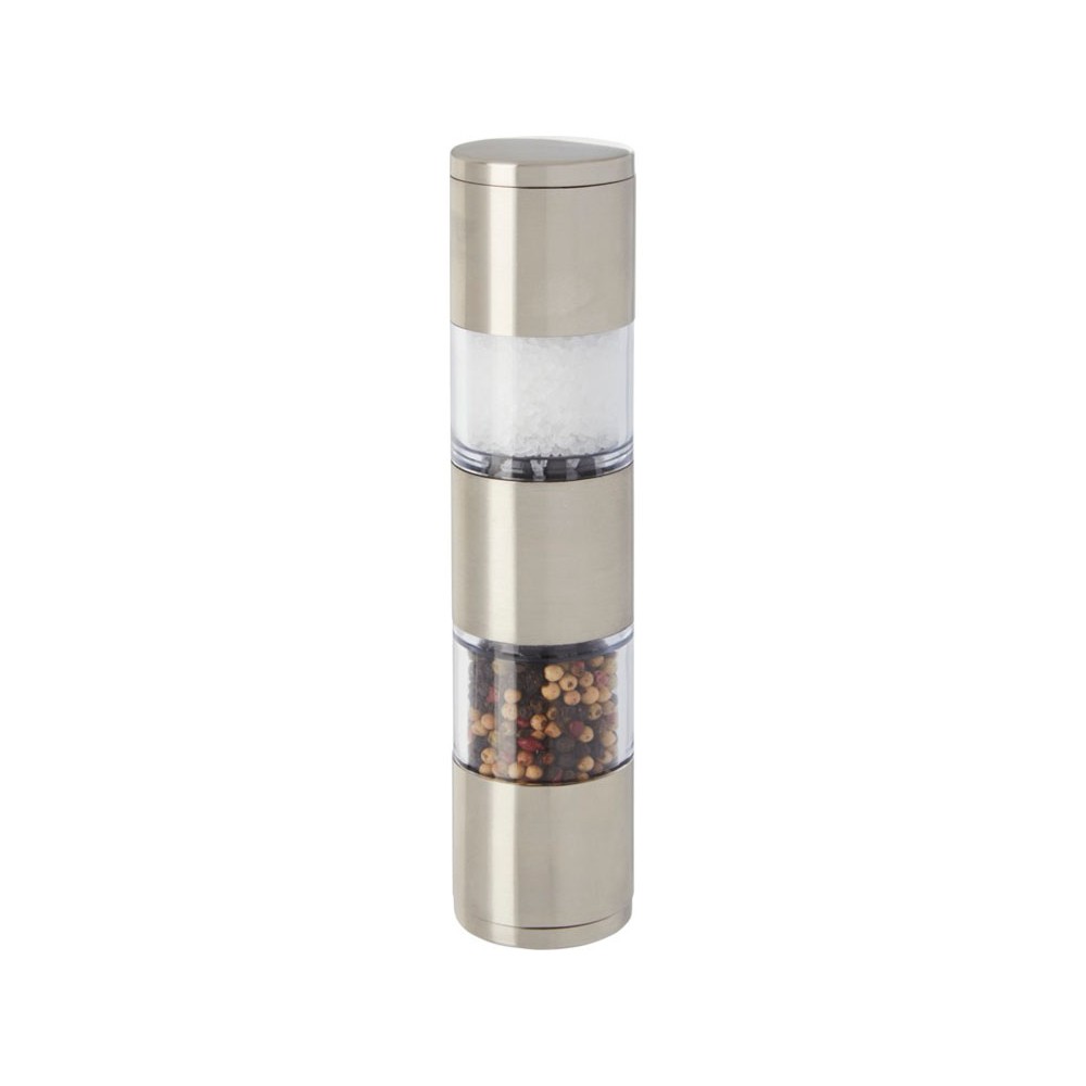 Двусторонняя мельница с одной стороной для соли, а второй для перца. Перец и соль в комплект не входят. Нержавеющая сталь, пластик PS.
