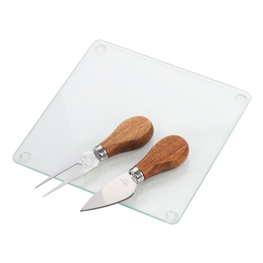 Вес313 Комплектностьразделочная доска 17 x17 х 0,7 см, вилка для сыра 12,5 см, нож для сыра 12 см, самоклеящиеся ножки/стопперы Материал товарастекло, акация/нержавеющая сталь