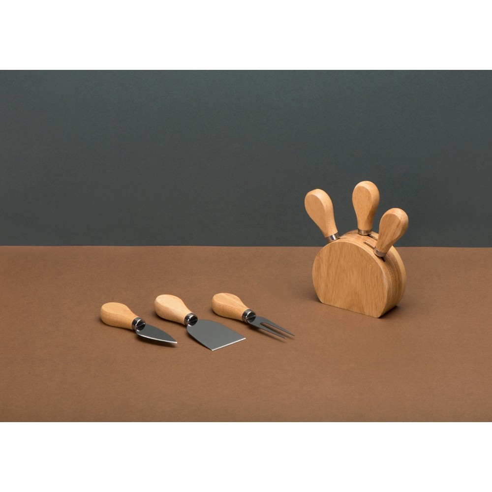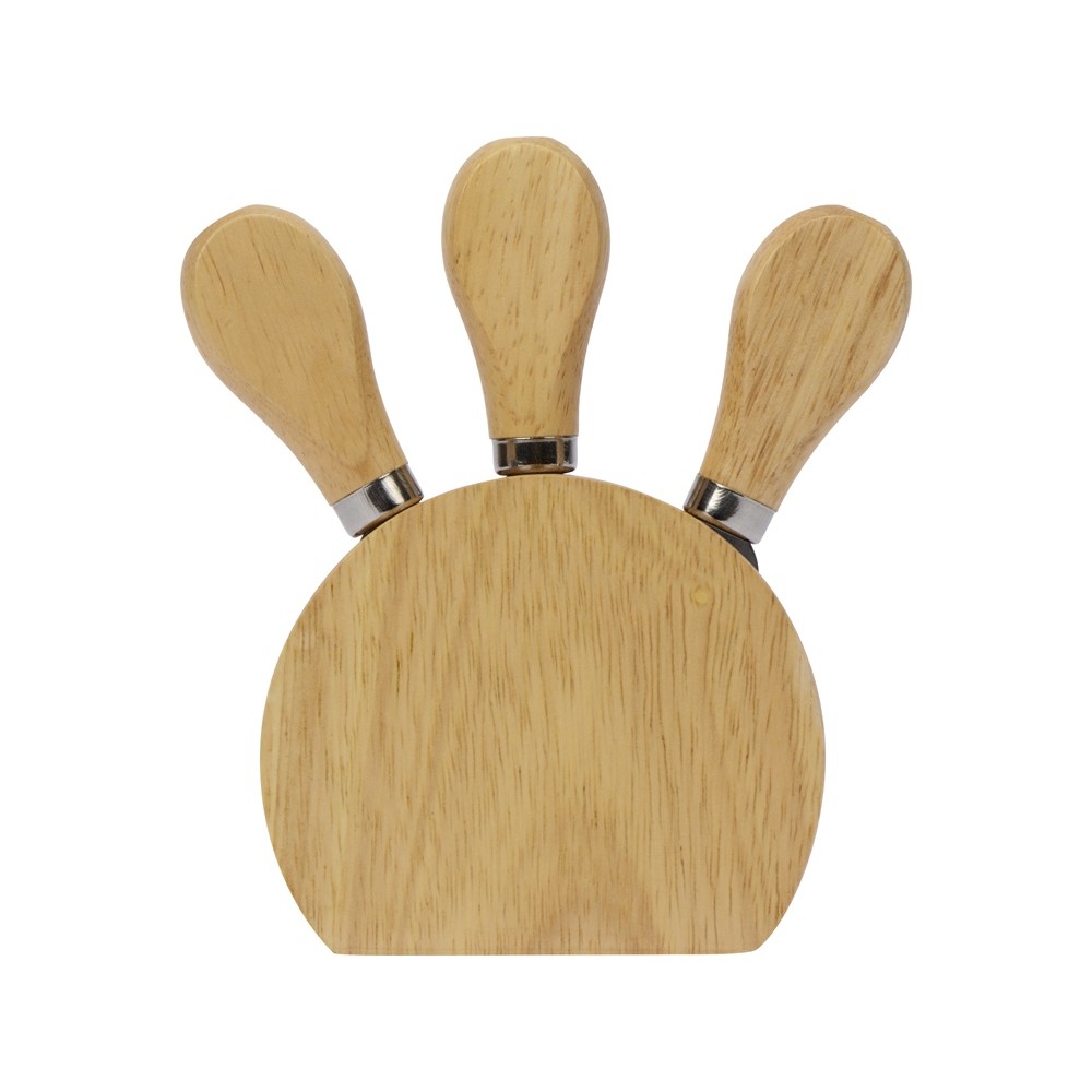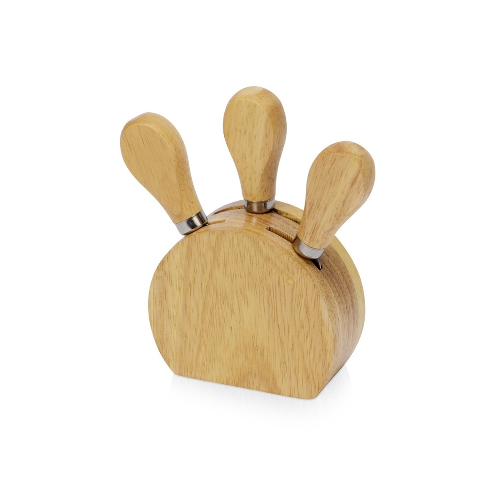 Вес295 Комплектностьвилка для сыра 12,3 см, нож листовидный 12 см, нож-лопатка 12,2 см, подставка 9,8 х 4 х 8,3 см Материал товаракаучуковое дерево, нержавеющая сталь
