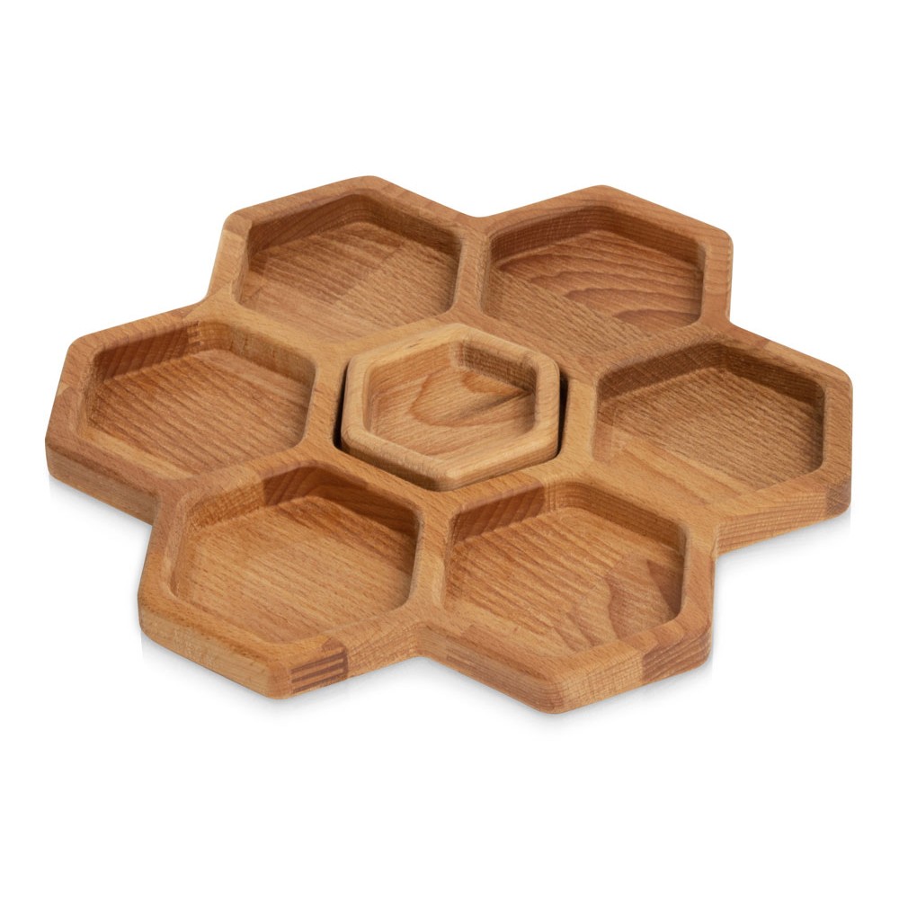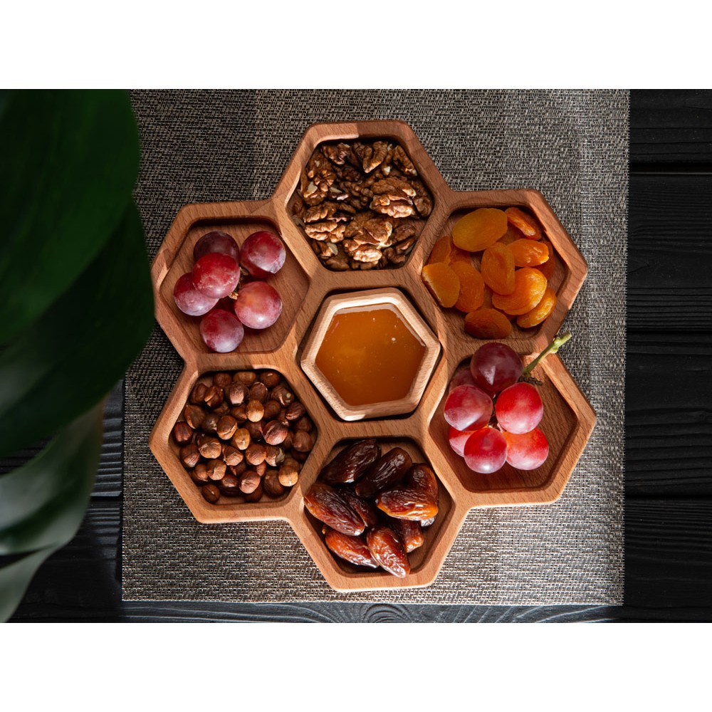 Менажница выполнена в виде семи сот для разных видов закусок — за бонусную дополнительную отвечает съемная сота-соусница, в которую можно залить мед или любимый соус.