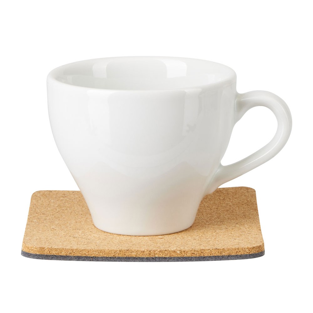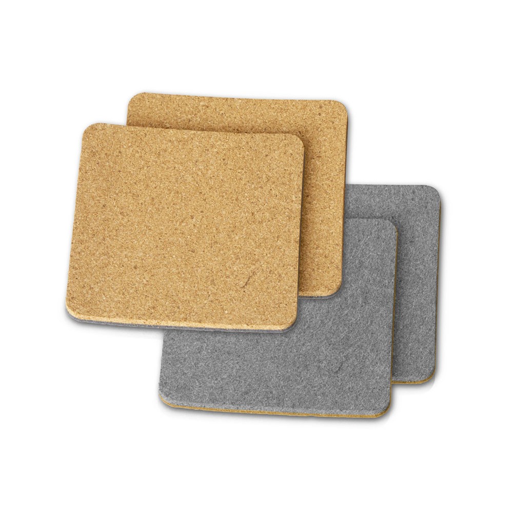 Четыре квадратных костера, выполненных из фетра и пробки. Благодаря выбору материалов «посадка» стаканов — мягкая и бесшумная: и пробка, и фетр заглушают звук, безопасны и для посуды, и для поверхности стола, защищая от механических повреждений и загрязнения.