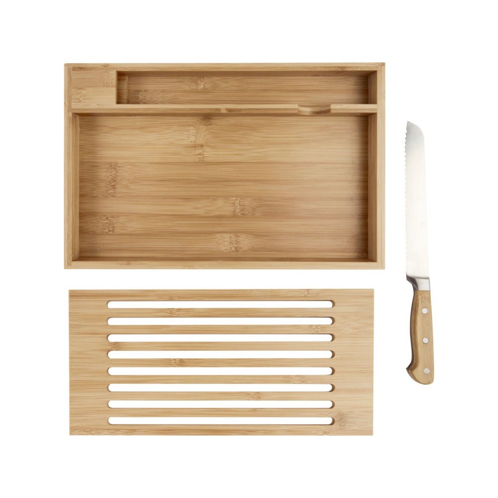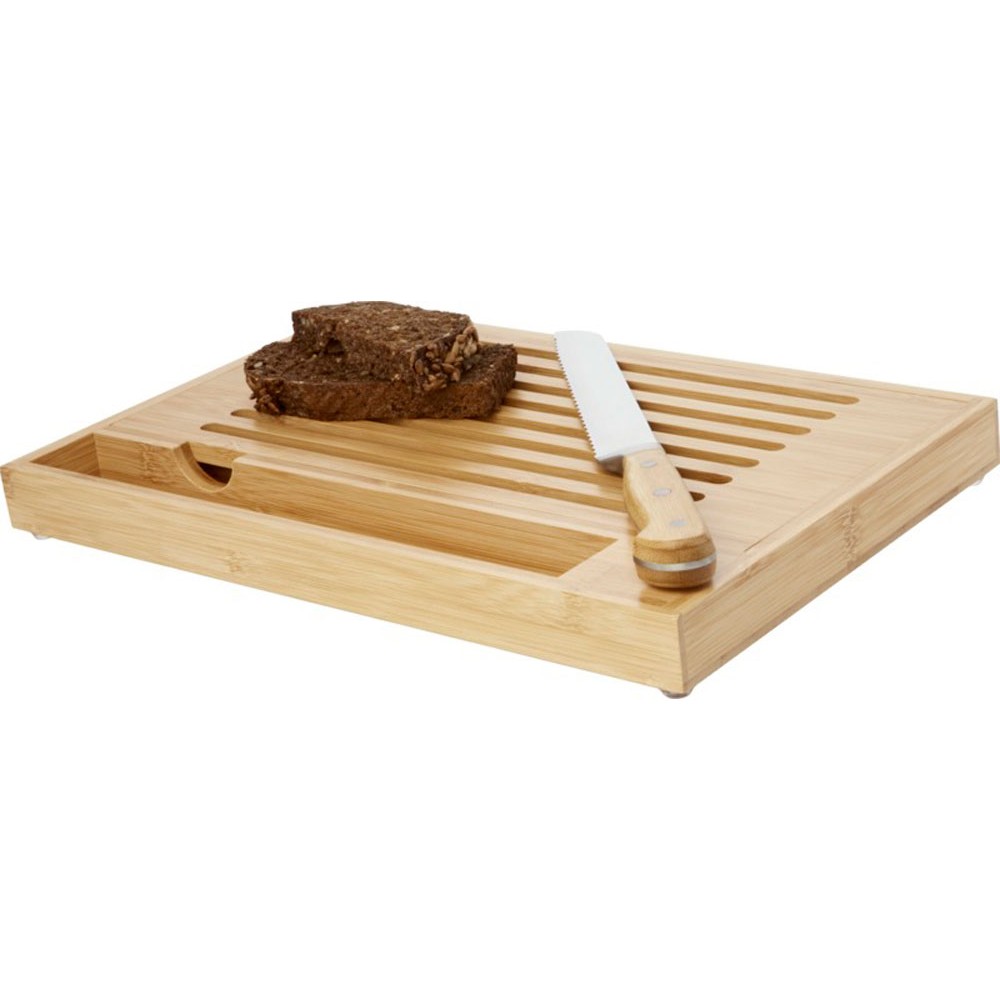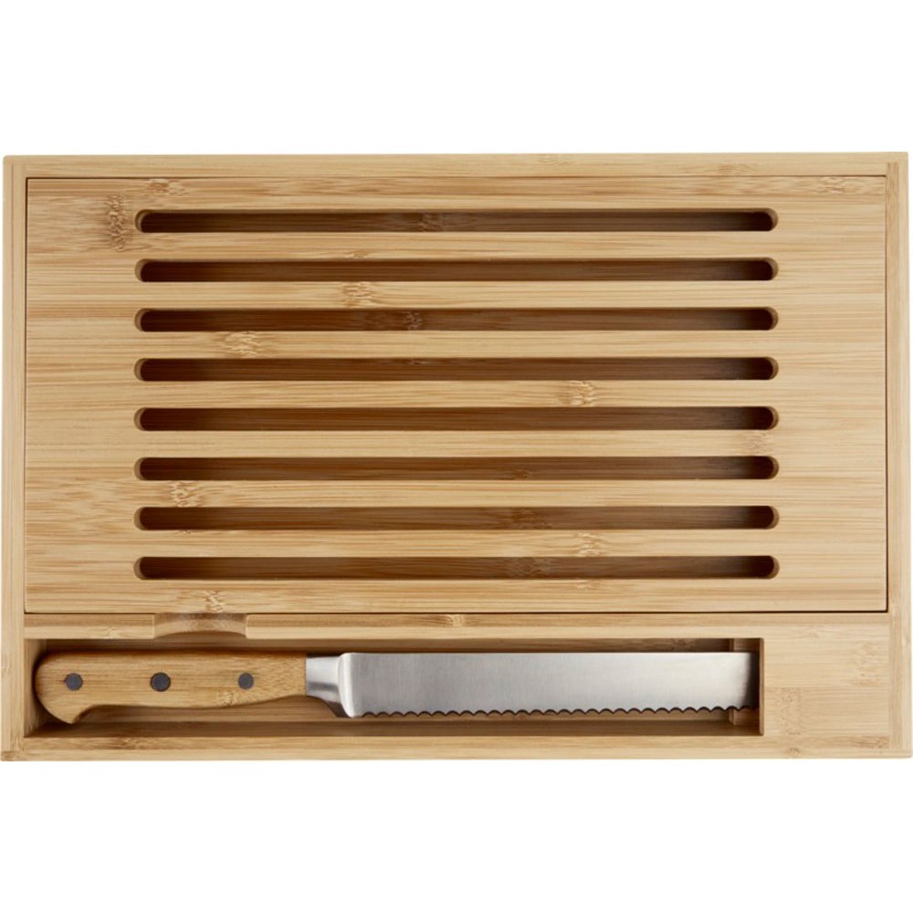 Бамбуковая разделочная доска с хлебным ножом с бамбуковыми ручками. Благодаря горизонтальной открытой модели крошки падают в поддон, что позволяет сохранить рабочее место или обеденный стол чистым. Размер ножа: 34 x 3 см. Бамбуковое дерево, нержавеющая сталь.