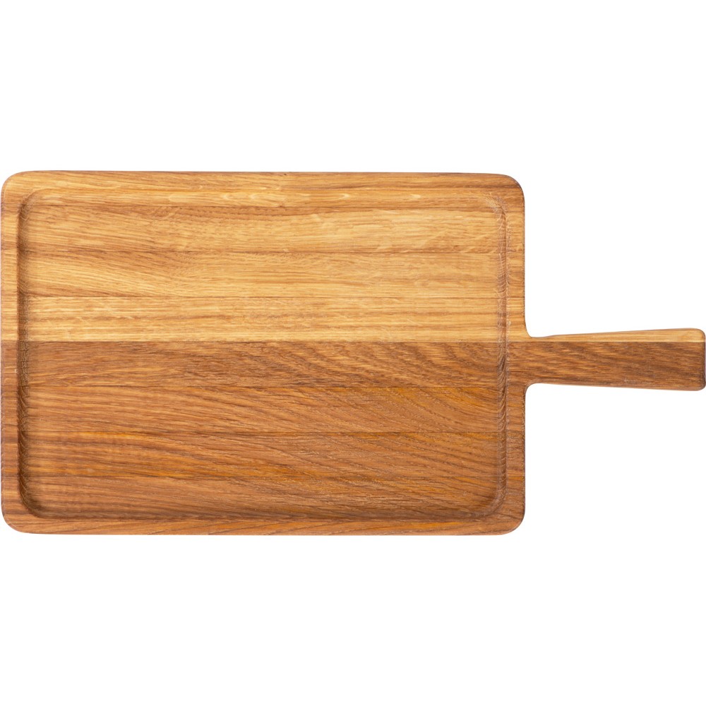 Доска обладает углублением и небольшими бортиками для стока жидкости из нарезаемых продуктов. Благодаря ручке её удобно использовать в качестве подноса или блюда.
