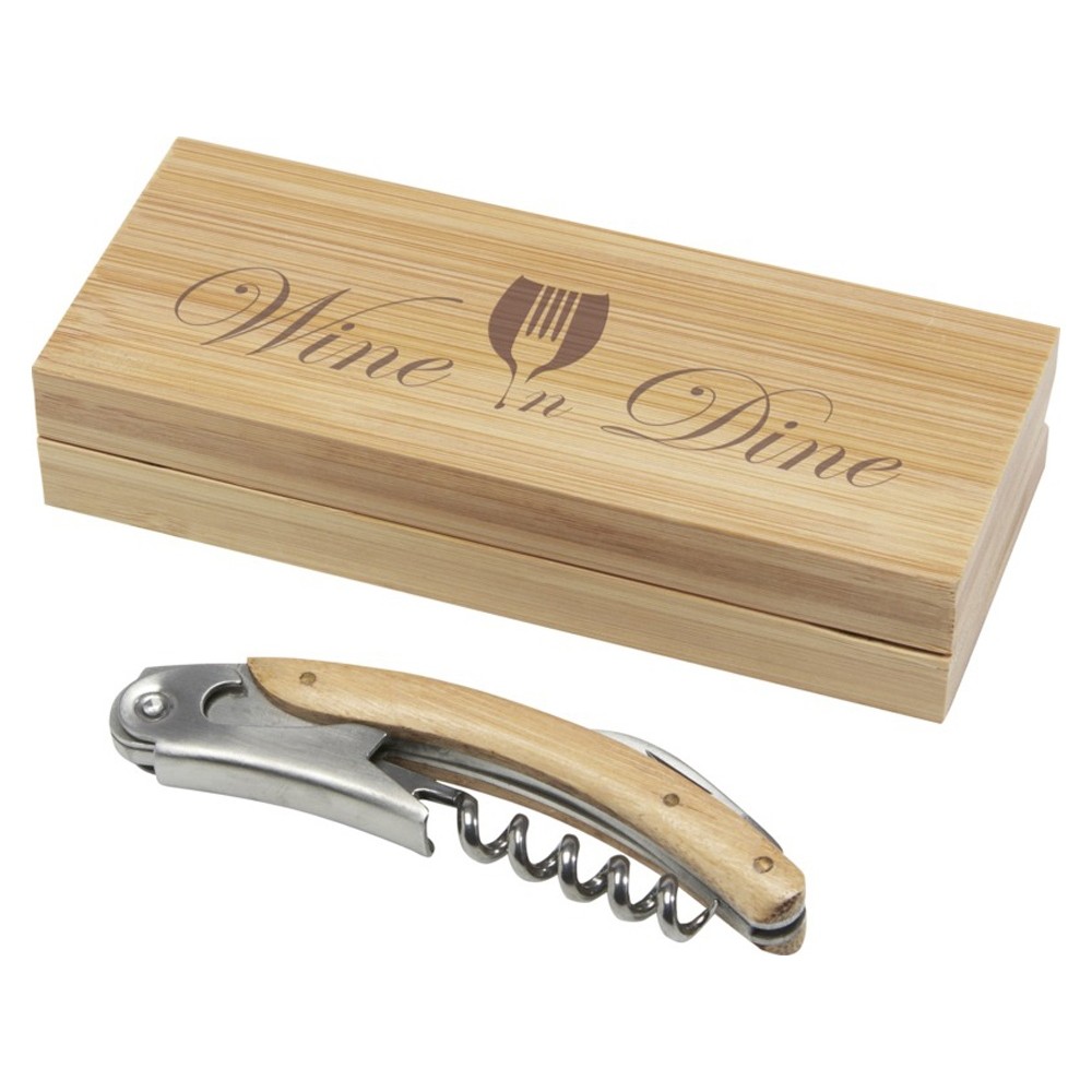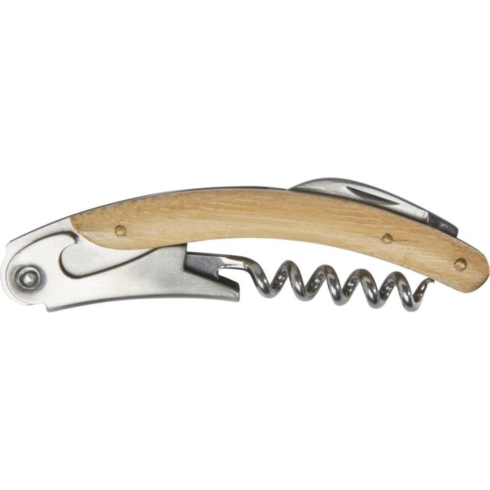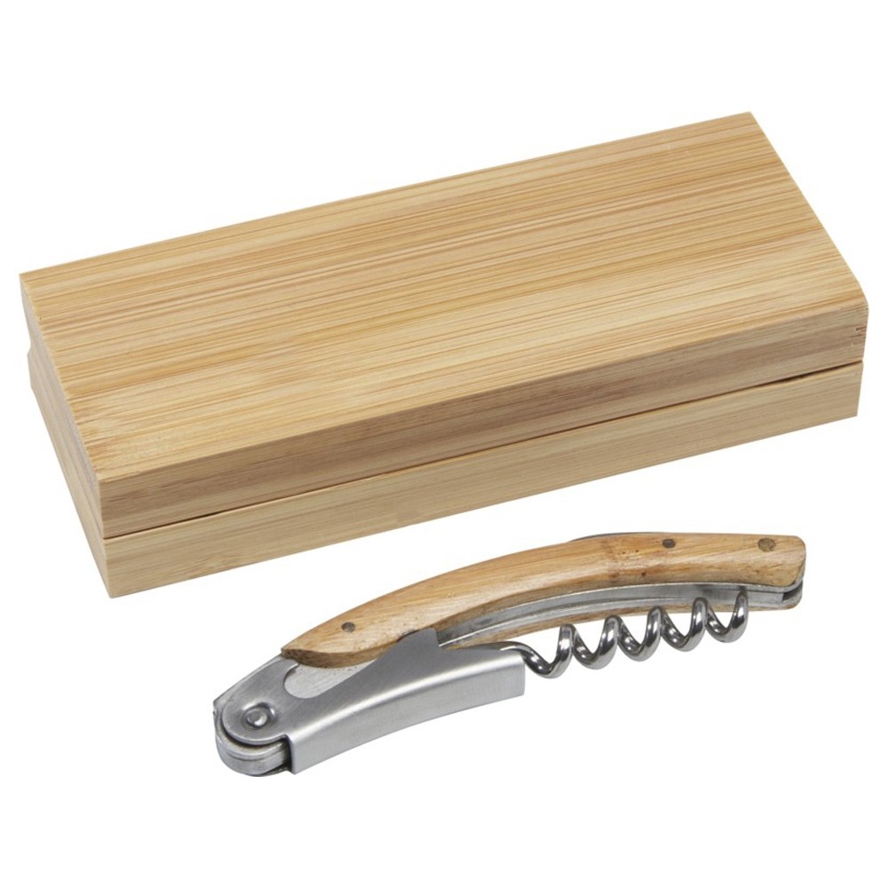 Нож официанта из нержавеющей стали со штопором и складным ножом для фольги и ручкой из натурального бамбука. Используемый бамбук поставляется и производится в соответствии со стандартами устойчивого развития.