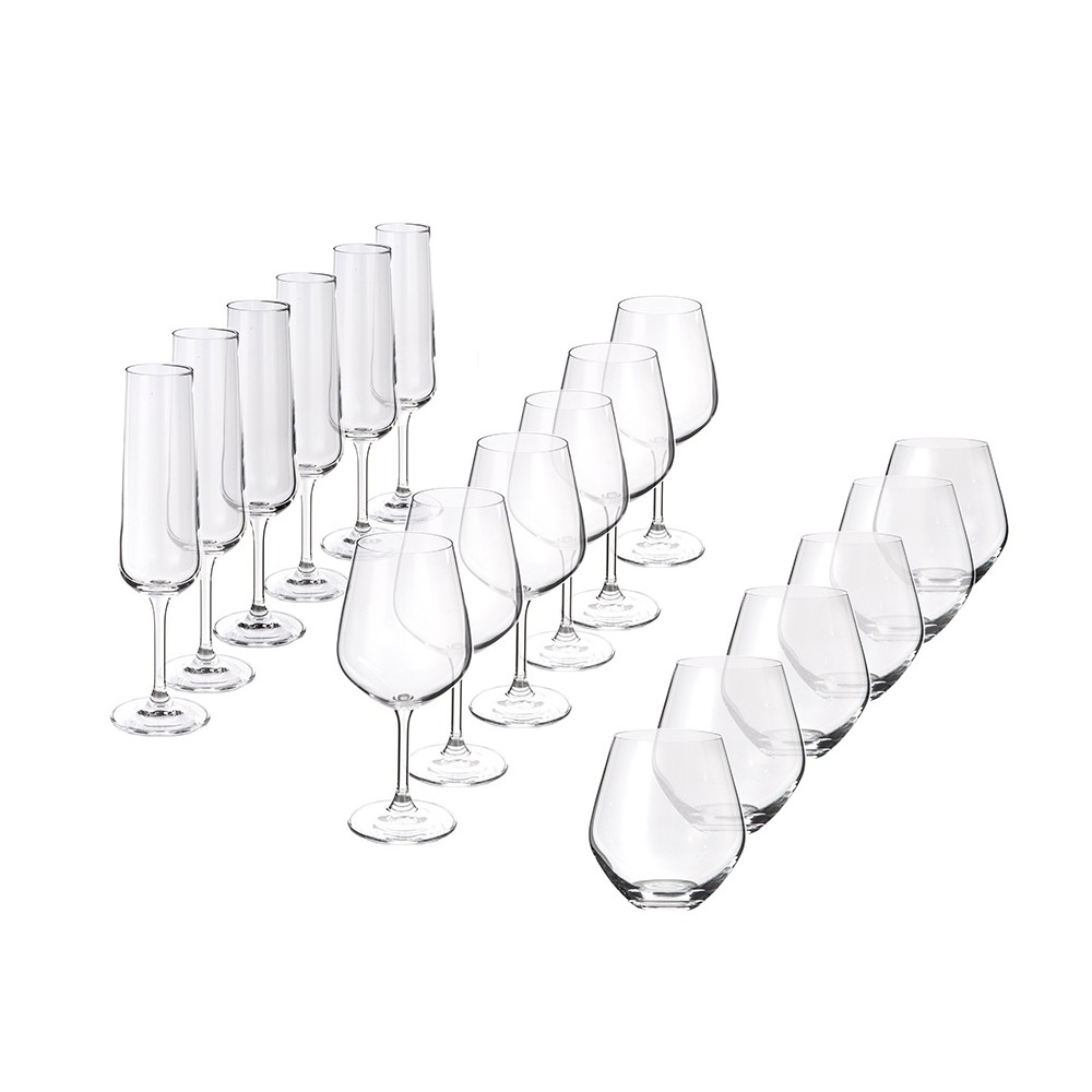 Набор бокалов состоит из 18 предметов - из шести бокалов-флютов для игристых вин, из шести бокалов для красного вина и из шести бокалов без ножки для разных видов напитков, в частности, для коктейлей. Все бокалы выполнены из бессвинцового хрусталя, экологически чистого материала, который сохраняет кристальную прозрачность, не тускнея и не мутнея.