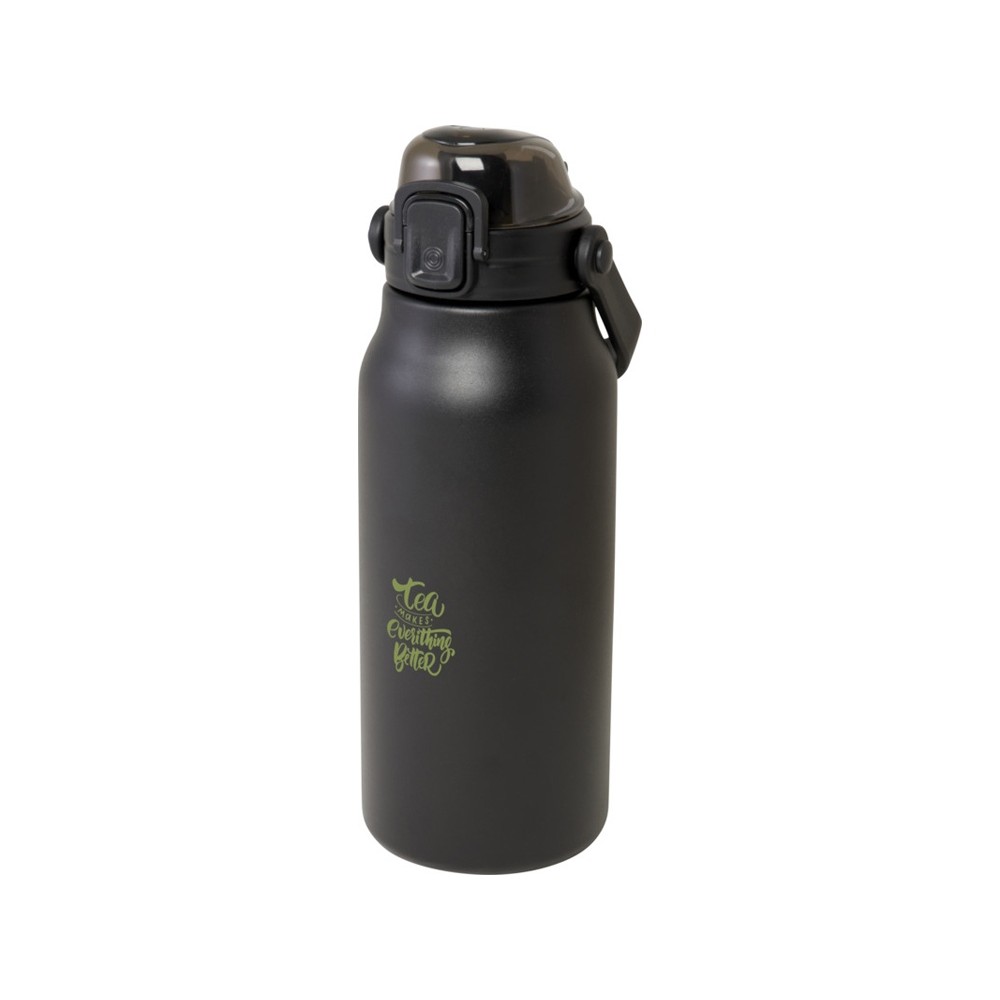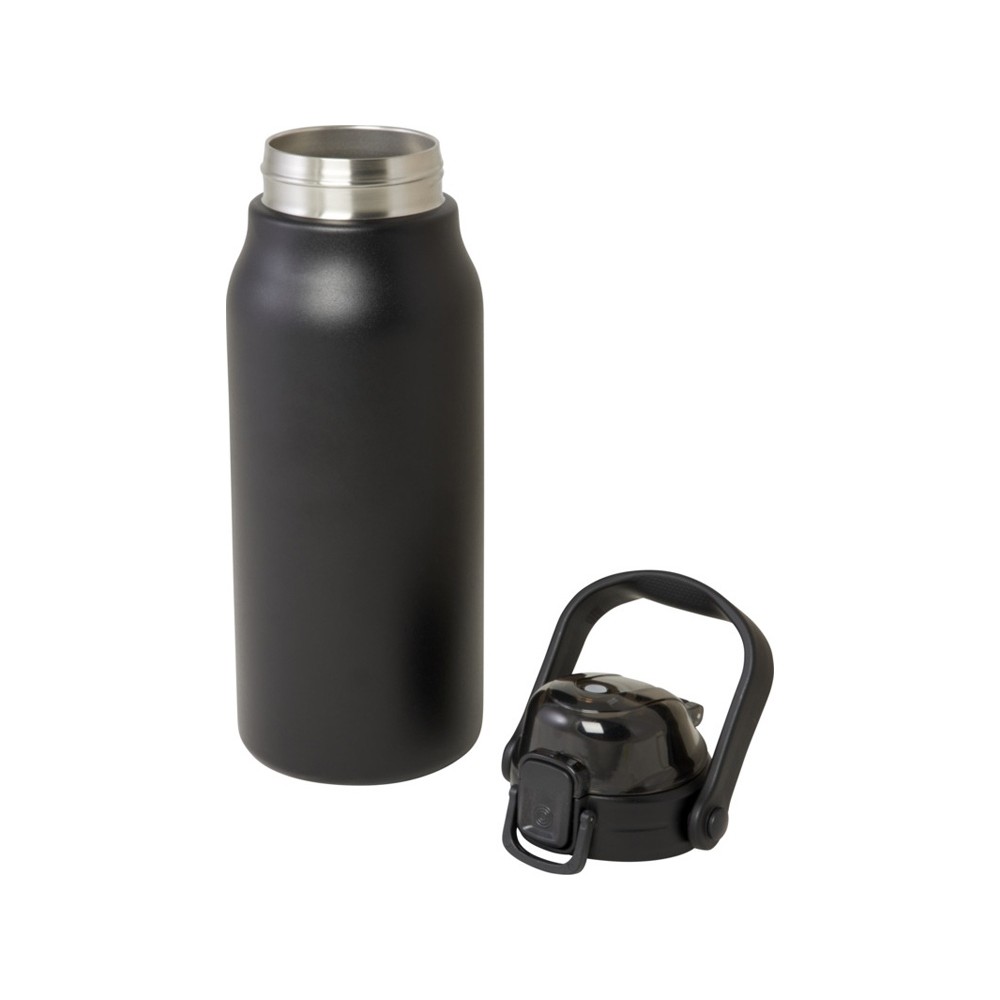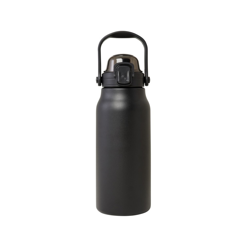 Эта большая бутылка из переработанной нержавеющей стали, сертифицированной RCS, позволит вам поддерживать водный баланс в течение дня и оставаться стильным. Медная вакуумная изоляция сохранит напитки горячими или холодными в течение нескольких часов, а благодаря складной ручке ее легко переносить. Бутылка герметична и имеет удобный механизм открывания с помощью кнопки. Объем составляет 1600 мл. Поставляется в подарочной коробке из переработанного картона. Recycled stainless steel, Recycled PP Plastic. Packaging: FSC Mix Credit P5.1 CU-COC-877277.