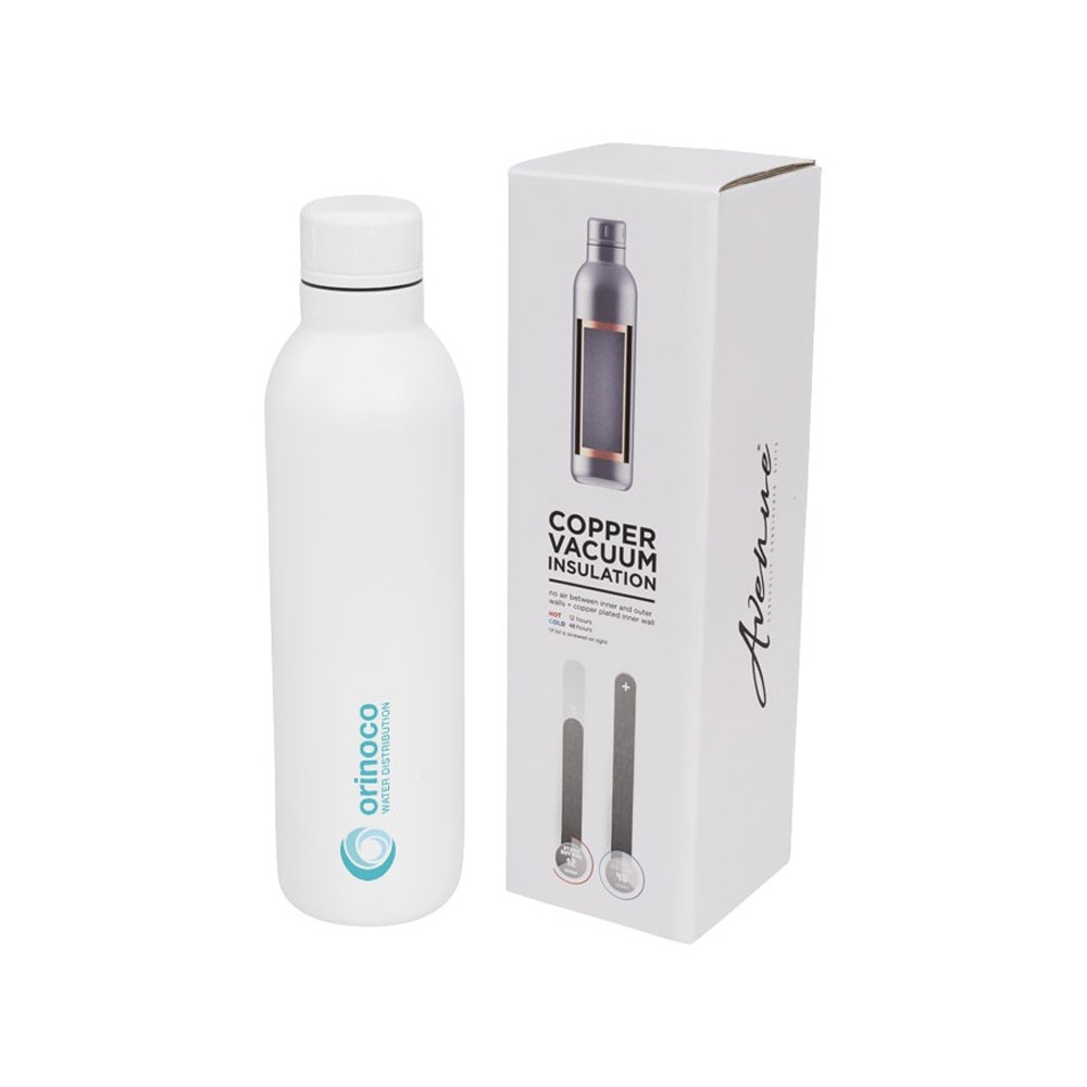 Спортивная бутылка Thor с вакуумной изоляцией объемом 510 мл. Прочная бутылка с двойными стенками из нержавеющей стали и вакуумной медной изоляцией сохраняет напитки холодными в течение 48 часов и горячими в течение не менее 12 часов. Конструкция бутылки предотвращает образование конденсата на внешней стороне. Модное, прочное порошковое покрытие. Герметичная завинчивающаяся крышка из нержавеющей стали. Объем – 510 мл. Предлагается в подарочной коробке Avenue. Нержавеющая сталь.