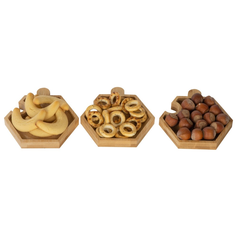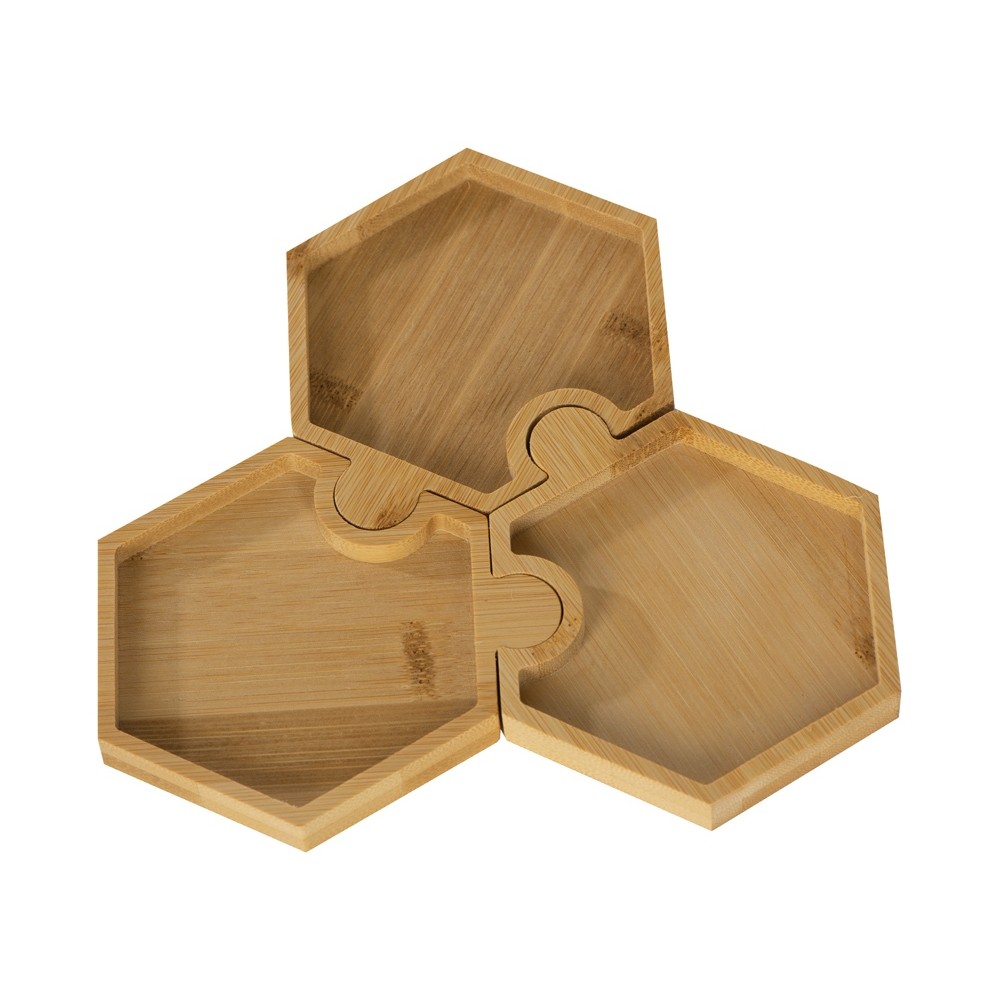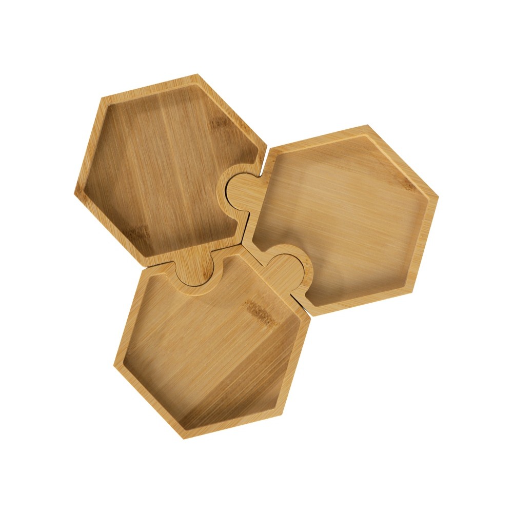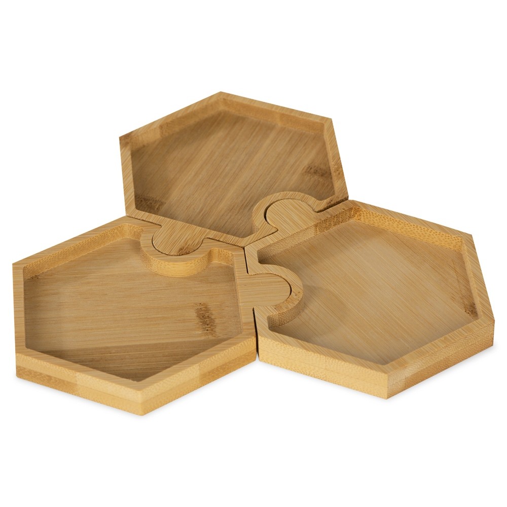 Три шестиугольных менажницы из бамбука могут использоваться как по отдельности, так и вместе, что особенно удобно при сервировке стола. Менажницы соединяются друг с другом пазами без применения каких-либо дополнительных средств.