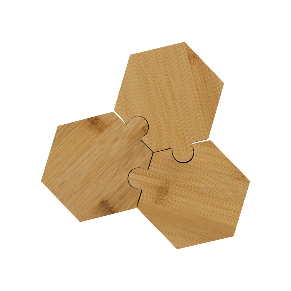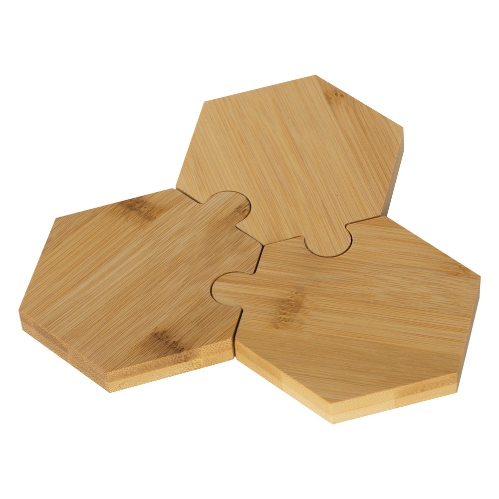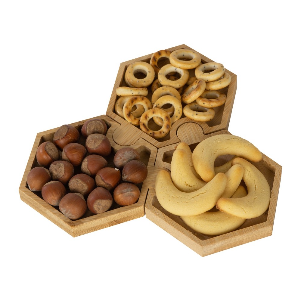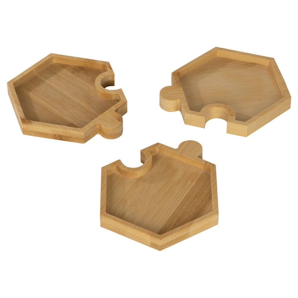 Три шестиугольных менажницы из бамбука могут использоваться как по отдельности, так и вместе, что особенно удобно при сервировке стола. Менажницы соединяются друг с другом пазами без применения каких-либо дополнительных средств.