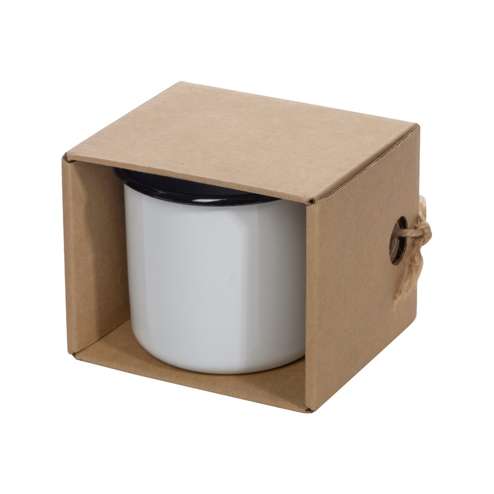 Эмалированная кружка поставляется в необычной упаковке — крафтовой коробке с открытой стенкой. Не беспокойтесь за комплектность — к упаковке кружка присоединена при помощи шпагата, продетого сквозь ручку и отверстия на углу коробки. Необычная подача создает первое впечатление от подарка, заставляя приглядеться к нему внимательнее.