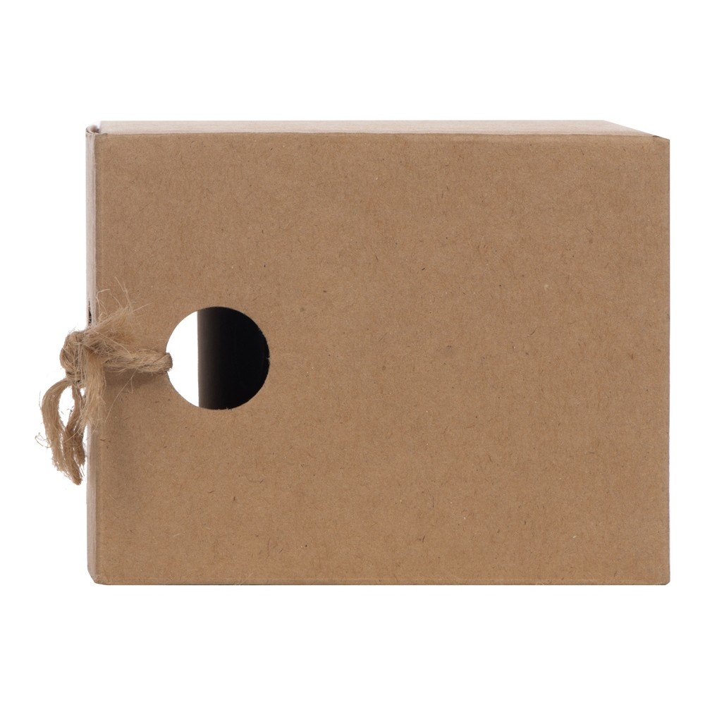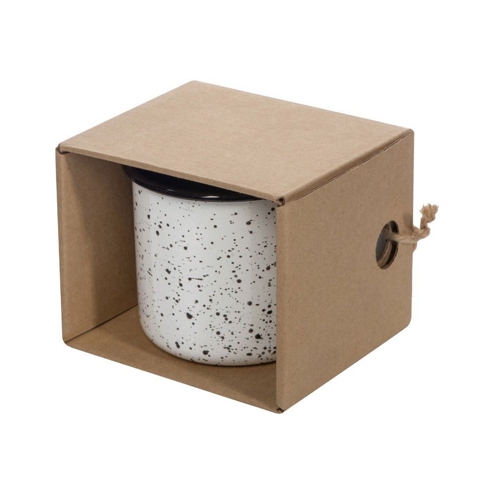 Эмалированная кружка поставляется в необычной упаковке — крафтовой коробке с открытой стенкой. Не беспокойтесь за комплектность — к упаковке кружка присоединена при помощи шпагата, продетого сквозь ручку и отверстия на углу коробки. Необычная подача создает первое впечатление от подарка, заставляя приглядеться к нему внимательнее.