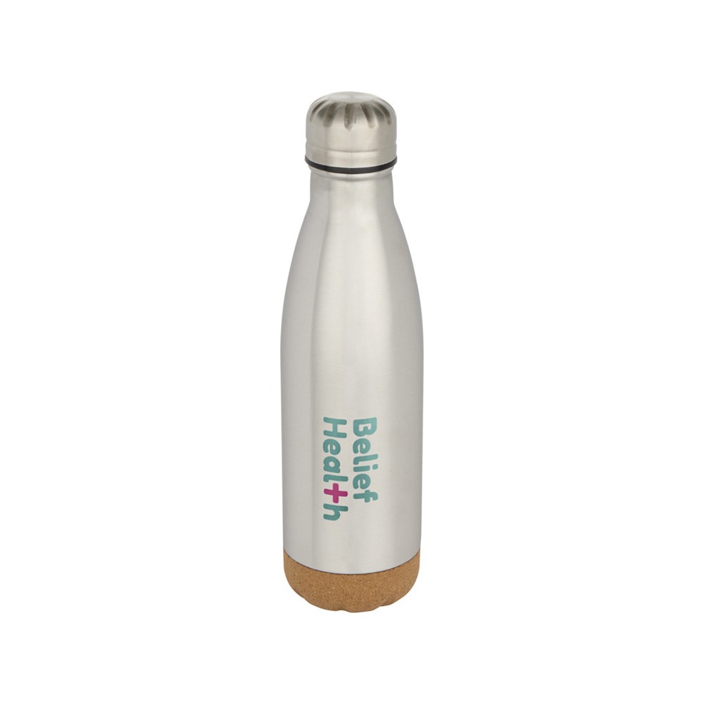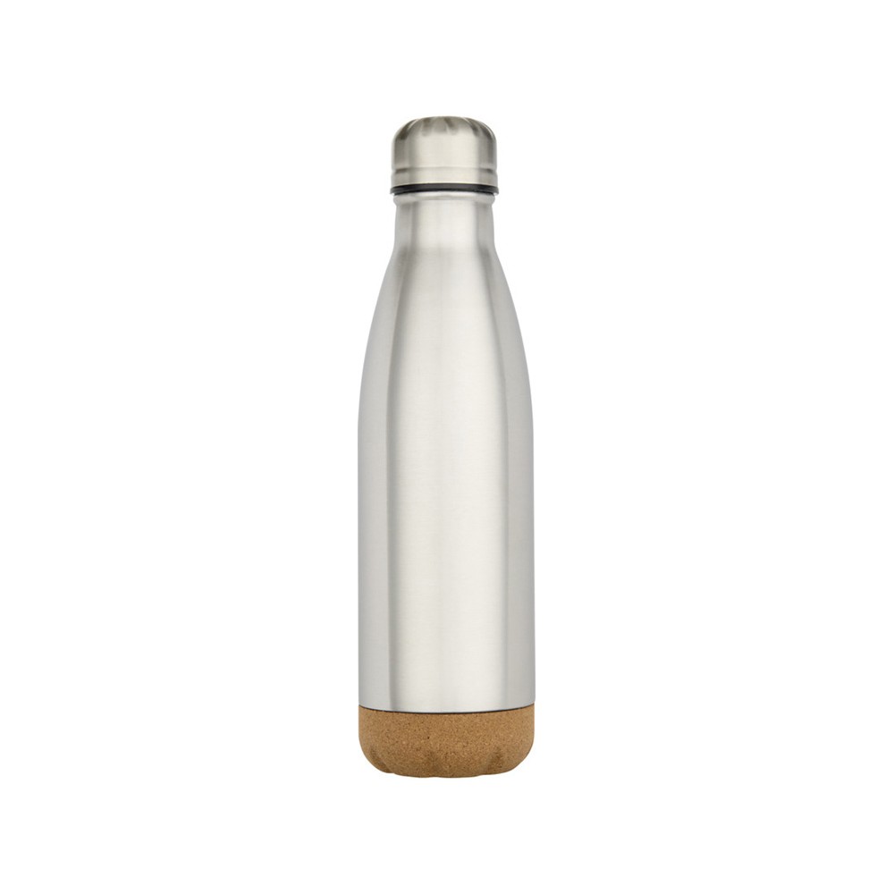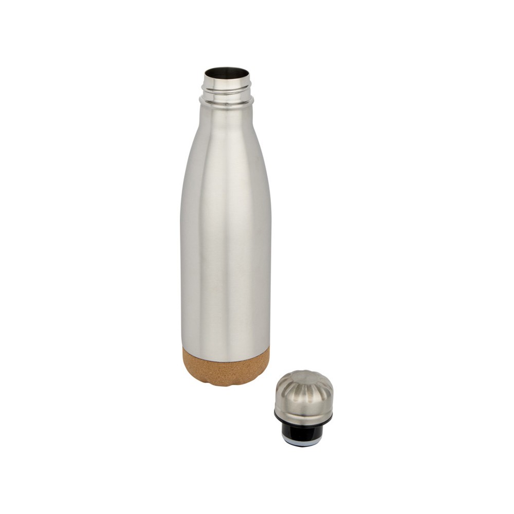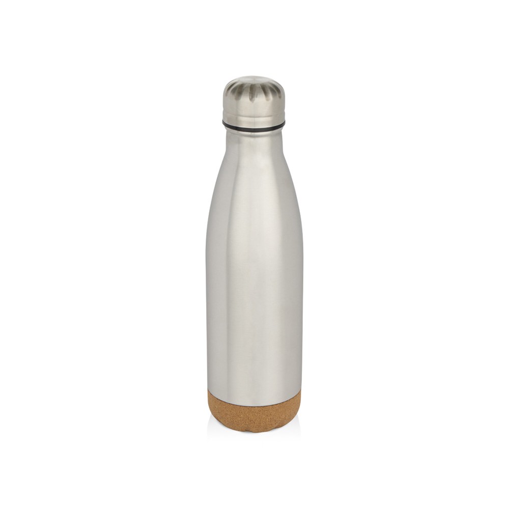 Бутылка для воды из нержавеющей стали с вакуумной изоляцией и пробковыми деталями в нижней части. Двойная изоляция стенок сохраняет напитки горячими или холодными в течение нескольких часов. Поставляется в подарочной коробке из переработанного картона. Объем: 500 мл. 90% нержавеющая сталь, 10% Пробка. упаковка FSC Mix Credit P5.1 CU-COC-877277.