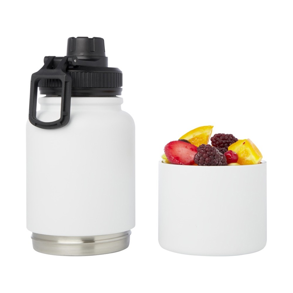 Многоразовая бутылка-термос из нержавеющей стали, сертифицированная RCS, со съемным контейнером для хранения. В верхней части бутылка имеет медный изолированный термос объемом 530 мл, который сохраняет напитки горячими или холодными в течение нескольких часов. Нижняя часть представляет собой контейнер с двойными стенками, вмещающий до 340 мл. Его можно использовать как чашку для любимых холодных напитков или для хранения закусок или других мелочей. Поставляется в подарочной коробке из переработанного картона. RCS certified recycled stainless steel, Recycled PP Plastic. Packaging: FSC Mix Credit P5.1 CU-COC-877277.