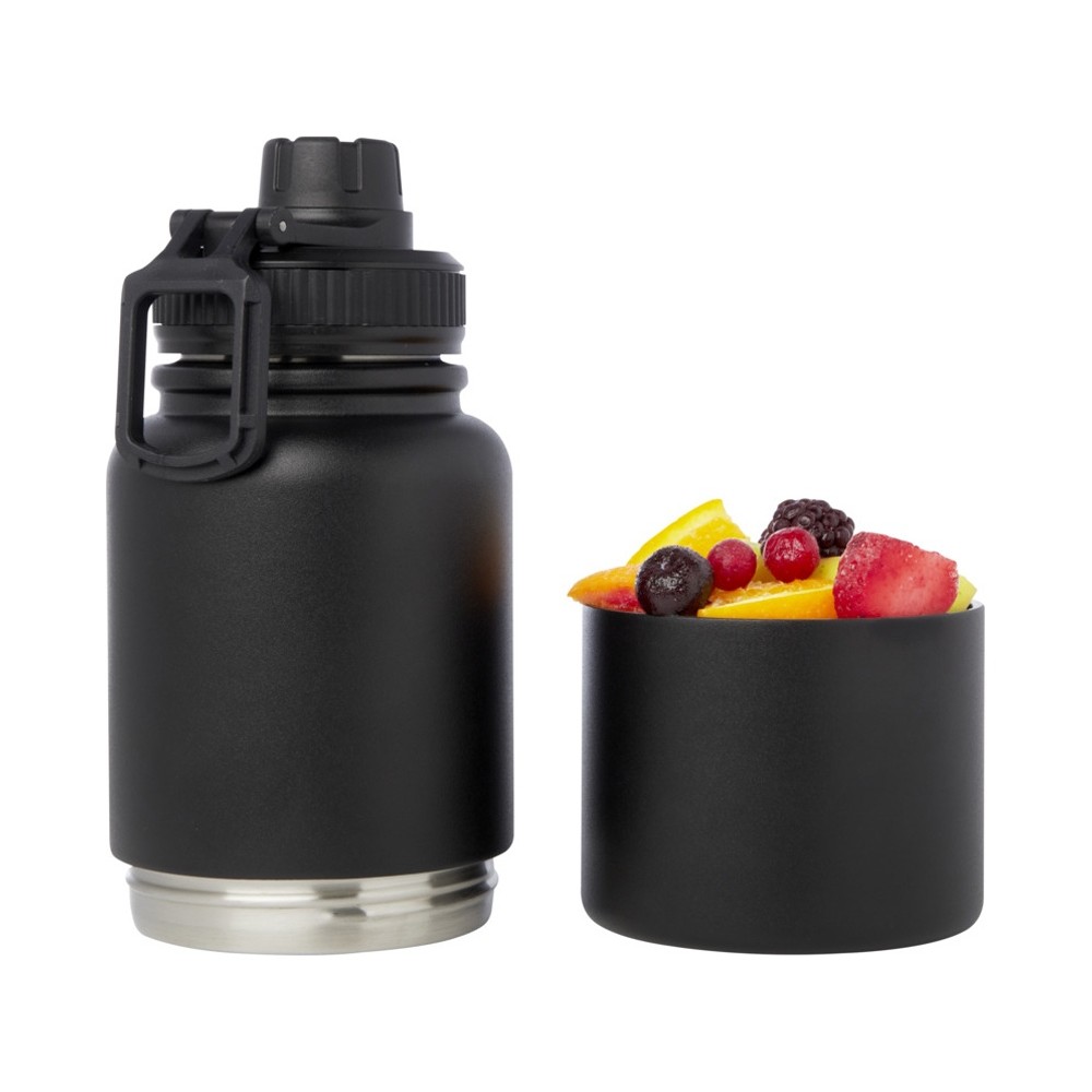 Многоразовая бутылка-термос из нержавеющей стали, сертифицированная RCS, со съемным контейнером для хранения. В верхней части бутылка имеет медный изолированный термос объемом 530 мл, который сохраняет напитки горячими или холодными в течение нескольких часов. Нижняя часть представляет собой контейнер с двойными стенками, вмещающий до 340 мл. Его можно использовать как чашку для любимых холодных напитков или для хранения закусок или других мелочей. Поставляется в подарочной коробке из переработанного картона. RCS certified recycled stainless steel, Recycled PP Plastic. Packaging: FSC Mix Credit P5.1 CU-COC-877277.
