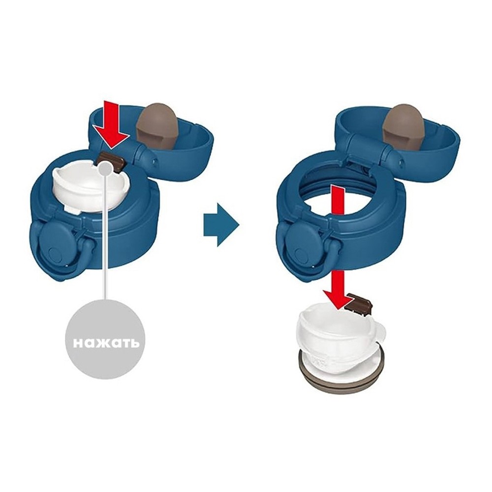 Термокружку можно быстро открыть одной рукой лёгким нажатием на кнопку - верхняя крышка откидывается на 180 градусов, фиксируется в открытом положении и не опрокидывается при питье.