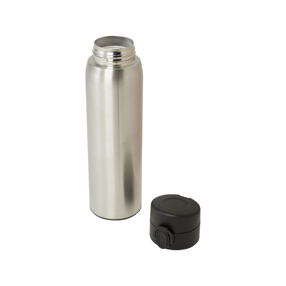 Стильная фляга-термос из переработанной нержавеющей стали, сертифицированная RCS, с простым механизмом открытия с помощью кнопки. Фляга герметична, а благодаря медной вакуумной изоляции напитки будут сохраняться горячими или холодными в течение нескольких часов. Объем составляет 450 мл. Поставляется в подарочной коробке из переработанного картона. Recycled stainless steel, Recycled PP Plastic. Packaging: FSC Mix Credit P5.1 CU-COC-877277.