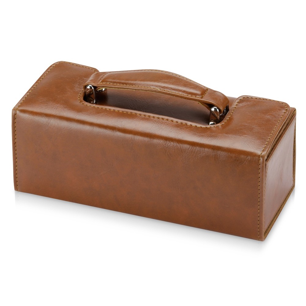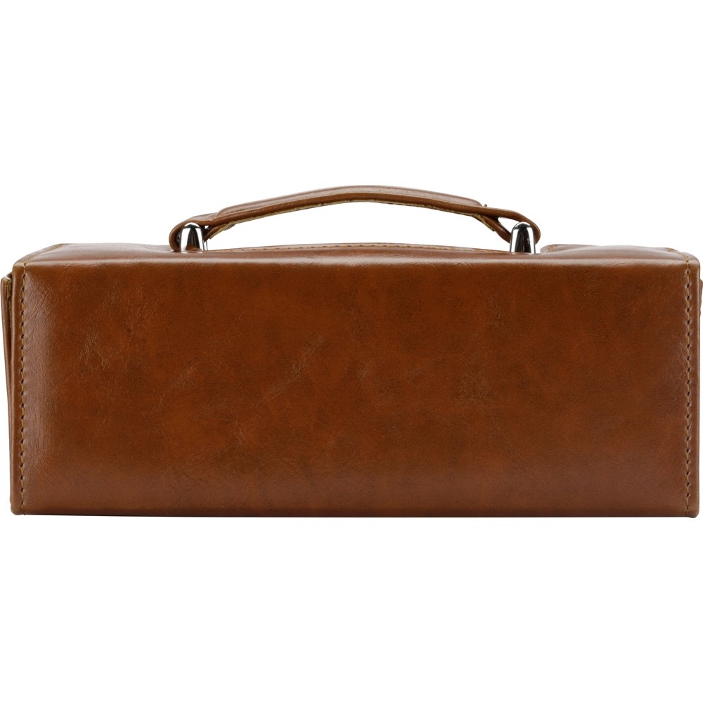 Настоящий сундучок из коричневого кожзама содержит целую кладезь полезных аксессуаров для чистки обуви. Набор не занимает много места при хранении и всегда готов прийти на помощь в поддержании чистоты вашей обуви. В набор входит 8 предметов. На футляр можно нанести логотип.