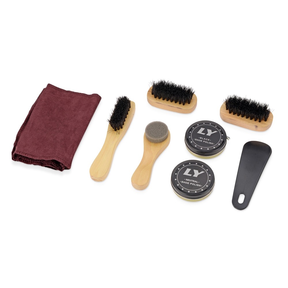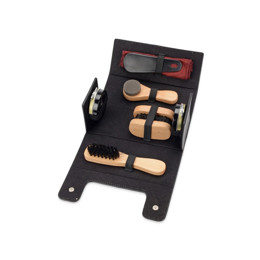 Комплектность черный крем, бесцветный крем, 1 губка, 3 щетки, ложка для обуви, салфетка