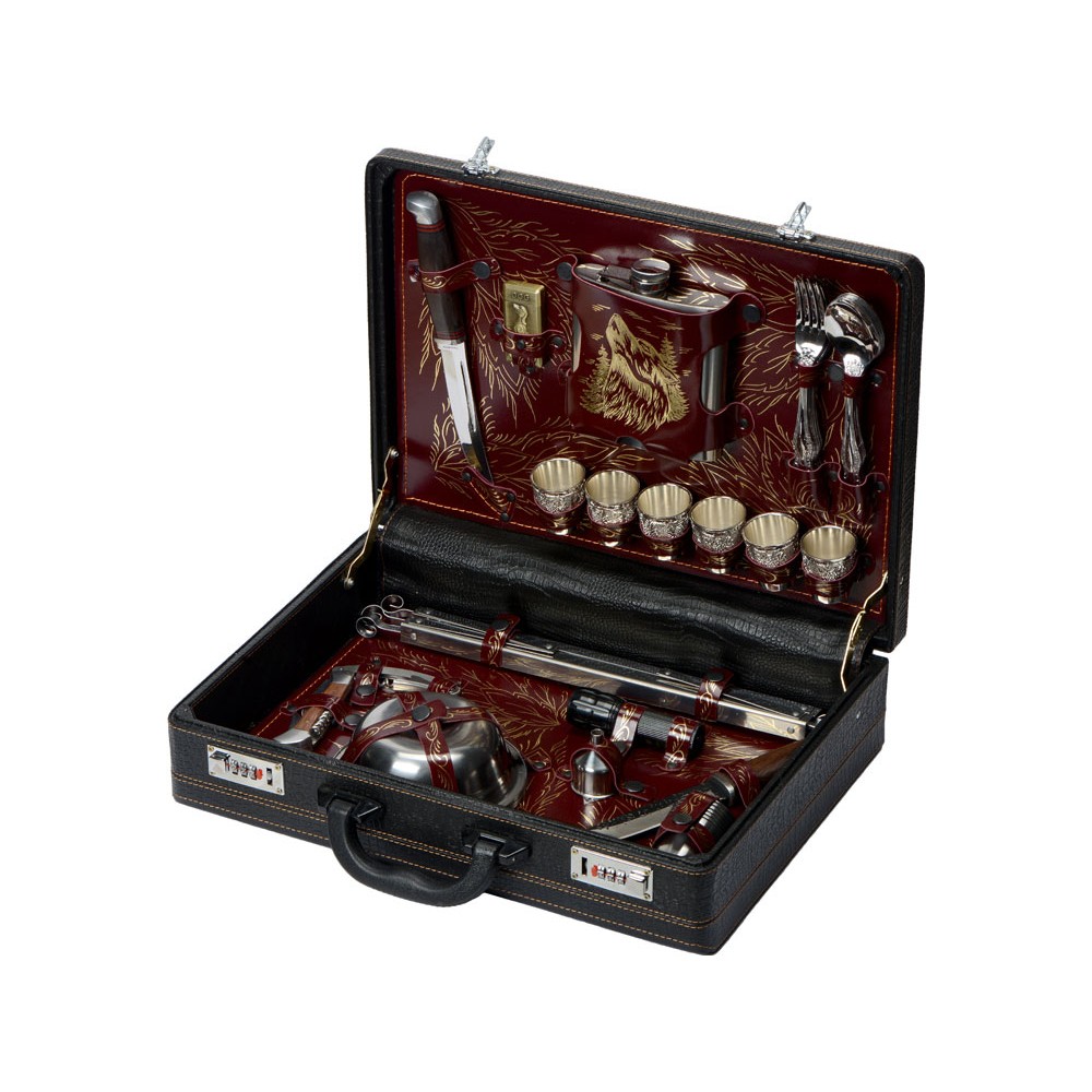 Комплектность нож складной, штопор, тарелка-6шт, воронка, нож"Басмач", стопка-6шт, нож"Кореш", зажигалка, стопка с узором-6шт, фляга, ложка-6шт, вилка-6шт, фонарь