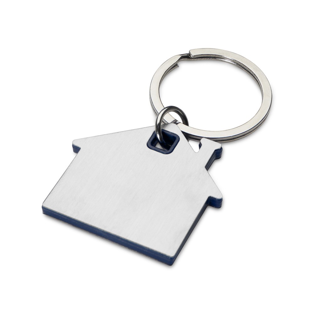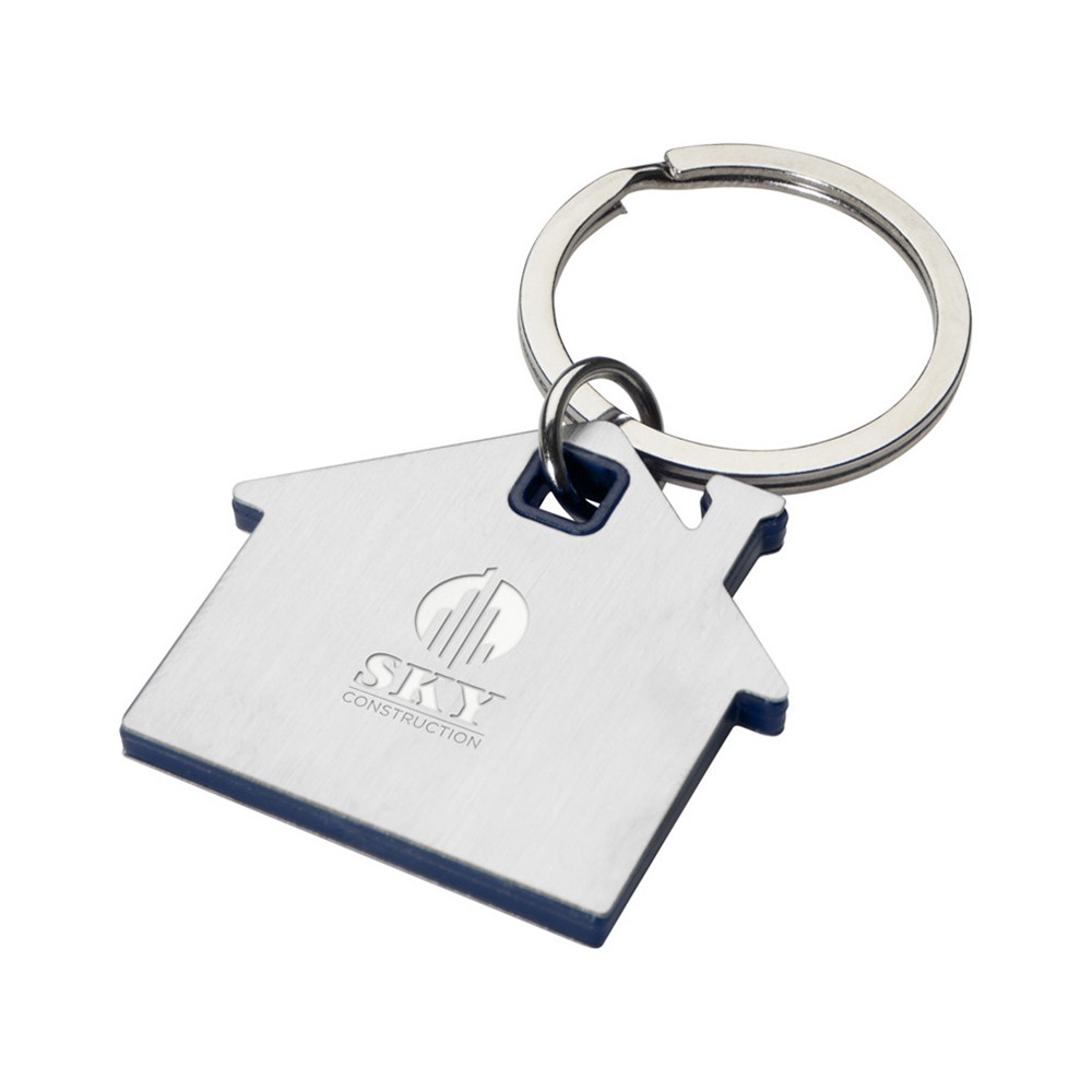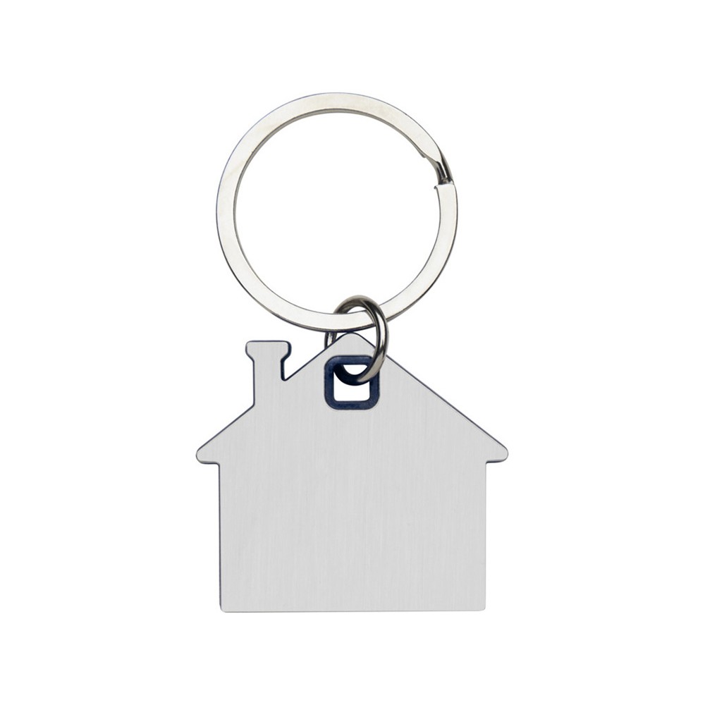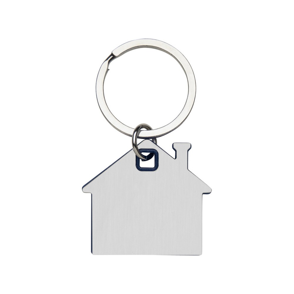 Брелок для ключей в форме домика с цветной вставкой из пластика между 2-мя серебристыми пластинами из стали.