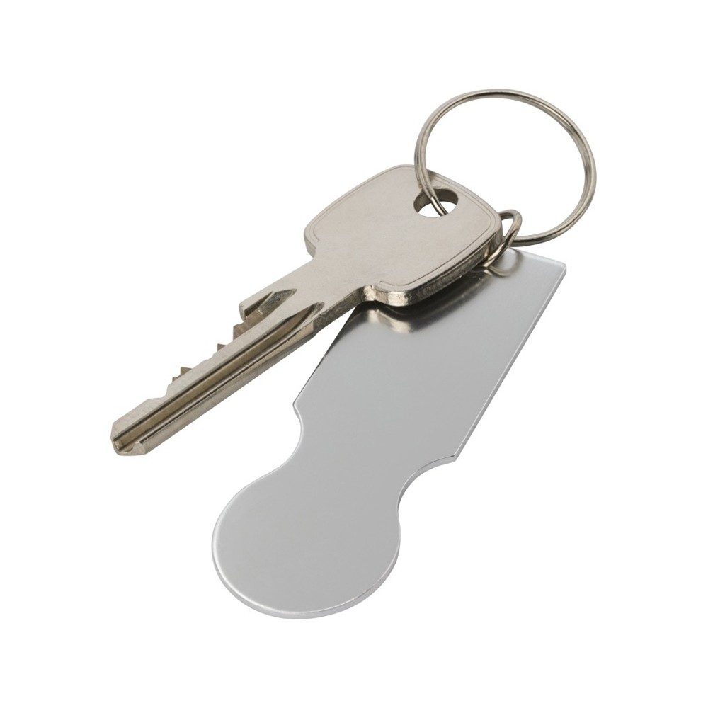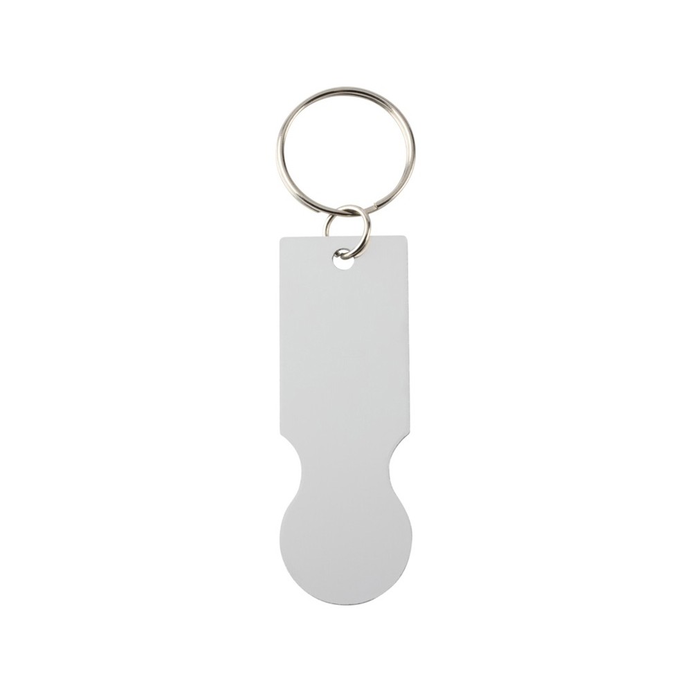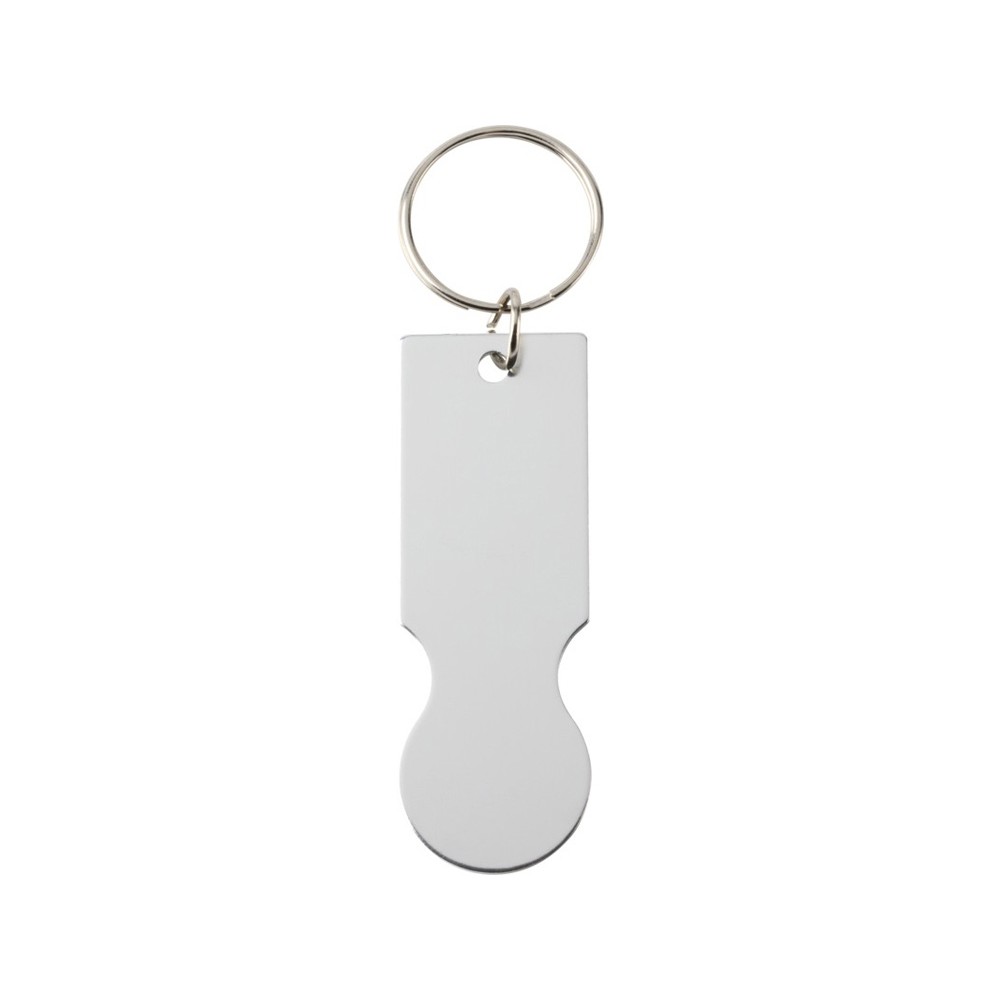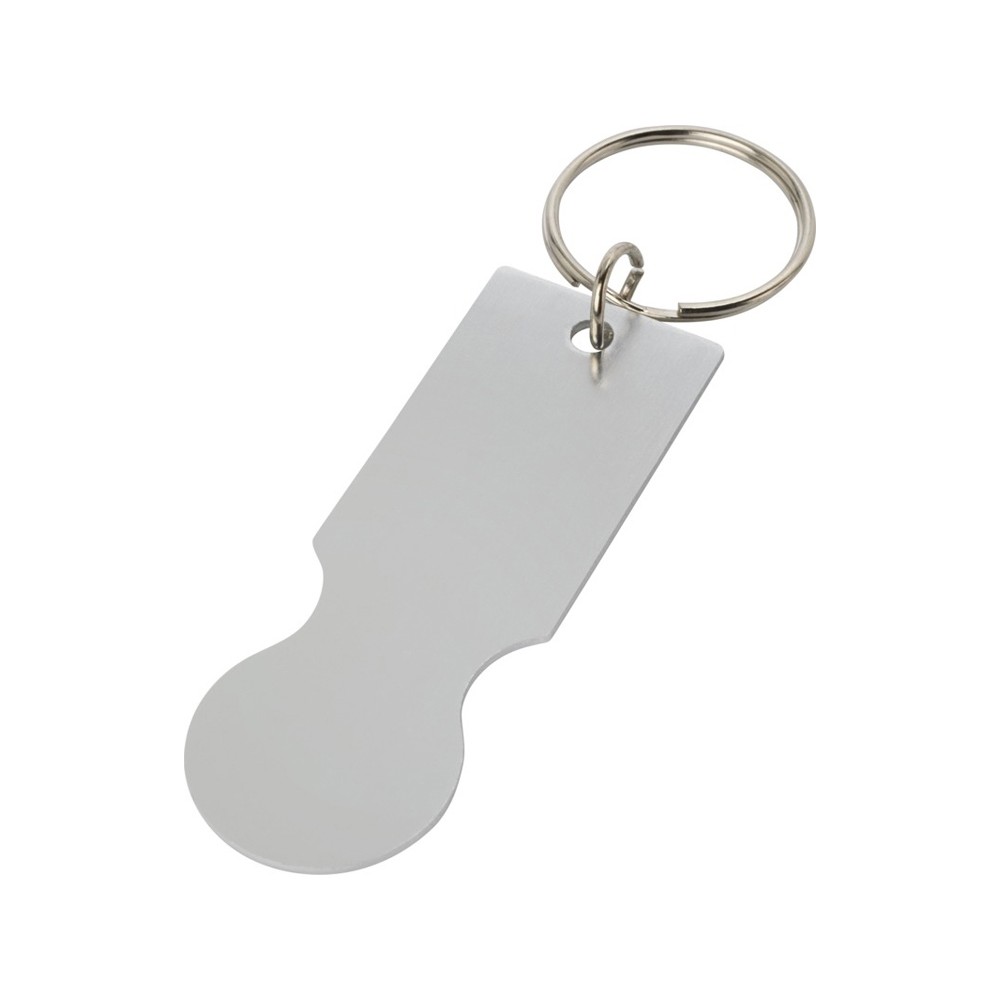 Металлический брелок для ключей Rhea с монетой для тележки предназначен для большинства тележек супермаркетов, позволяя открывать их без монет или жетонов. Сделан из переработанного алюминия.