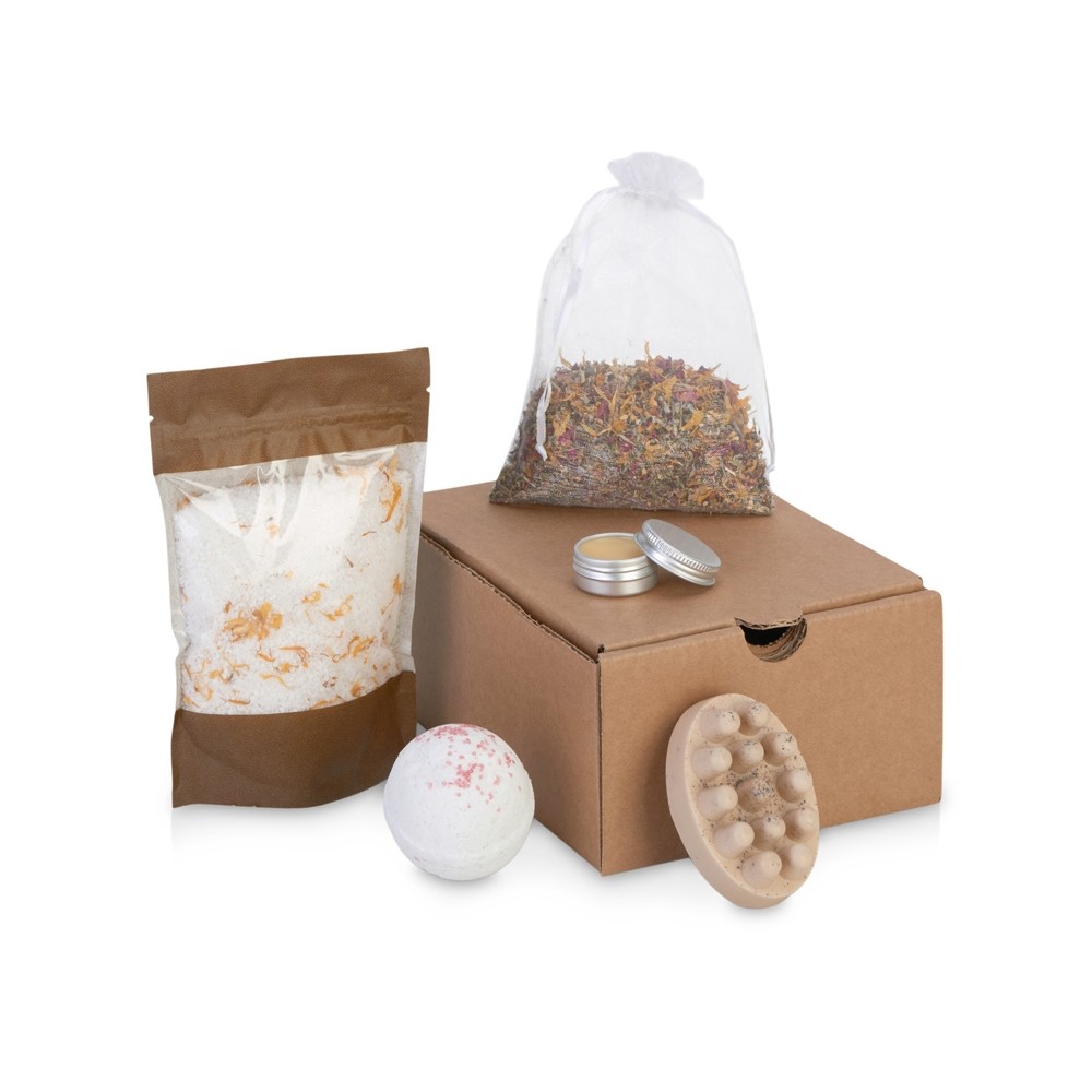 Комплектность соль для ванны, чайные травы в мешочке, бальзам для губ, массажное мыло с кофе, бомбочка для ванны