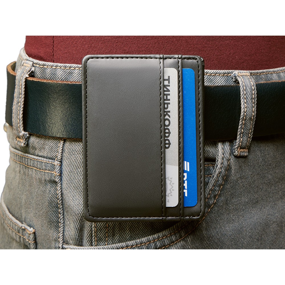 Картхолдер — стильное и практичное решение для деловых людей. В отличие от классических кошельков и портмоне он занимает совсем немного места и с лёгкостью поместится в карман. Данная модель благодаря зажиму на обороте также удобно цепляется за ремень джинс или на ланъярд.