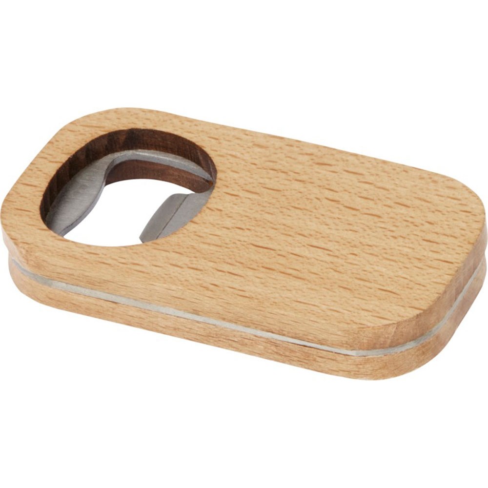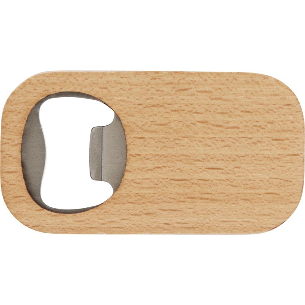 Открывалка для бутылок из нержавеющей стали с деревянной поверхностью. Дерево, нержавеющая сталь.