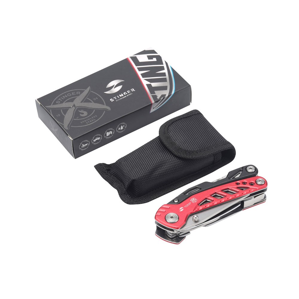 • Мультитул Stinger, 105x30 мм, 11 функций, сталь/алюминий, красно-чёрный, в нейлоновом чехле
