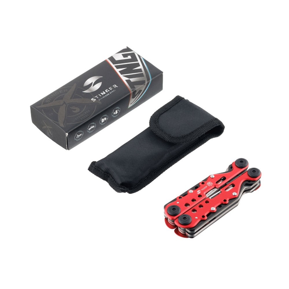 Мультитул Stinger, 105x40 мм, 13 функций, сталь, красно-серебристый, в комплекте нейлоновый чехол