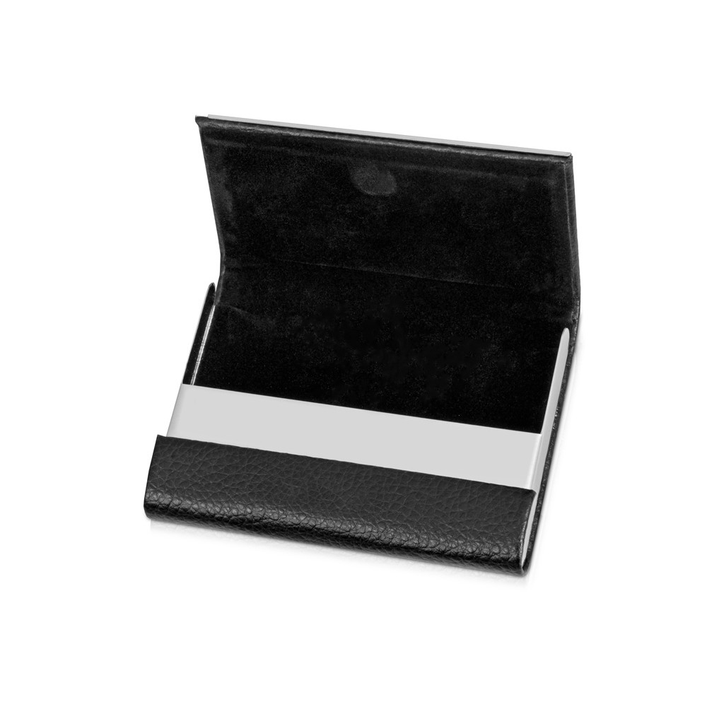 Визитница на магните выполнена из металла с искусственной кожей снаружи и черном бархатом внутри.