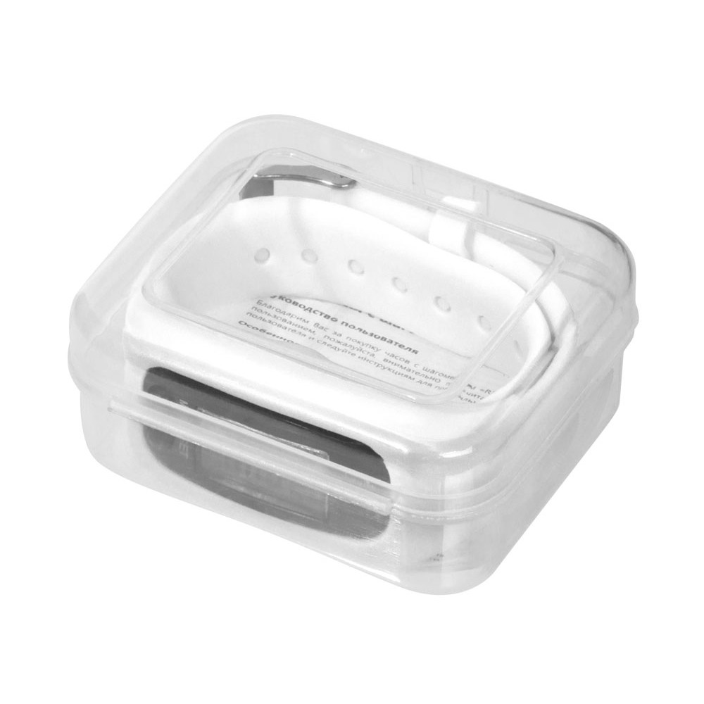 Наручные часы с возможностью отображения времени, калорий, шагов и дистанции. Есть переключение между метрической и британской системами измерений. На силиконовом ремешке можно сделать гравировку. Часы упакованы в пластиковую коробку, которую можно использовать для нанесения. Батарейка в комплекте.