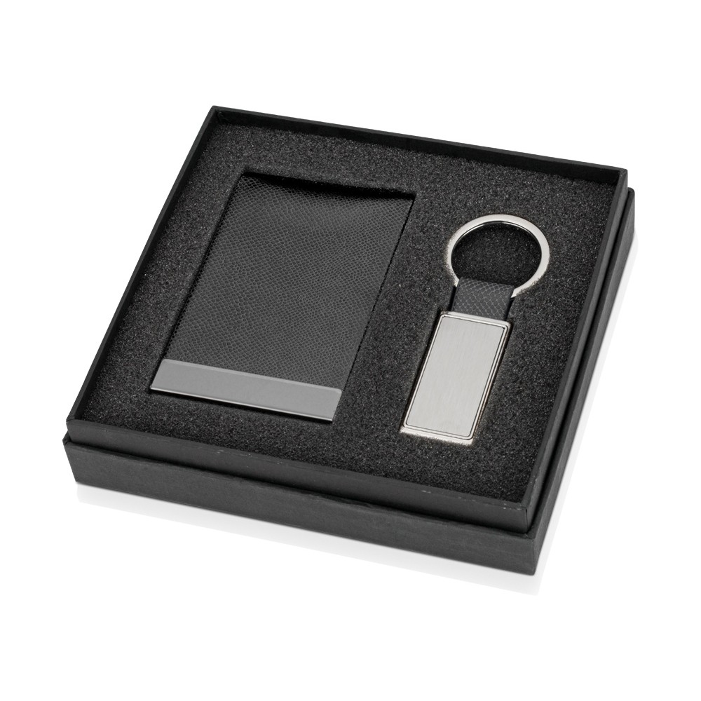 Визитница из кожзаменителя и металлический брелок прямоугольной формы - идеальный тандем из бизнес-атрибутов, которые всегда дополнят образ делового человека и принесут ему пользу. Набор можно персонализировать методом гравировки.